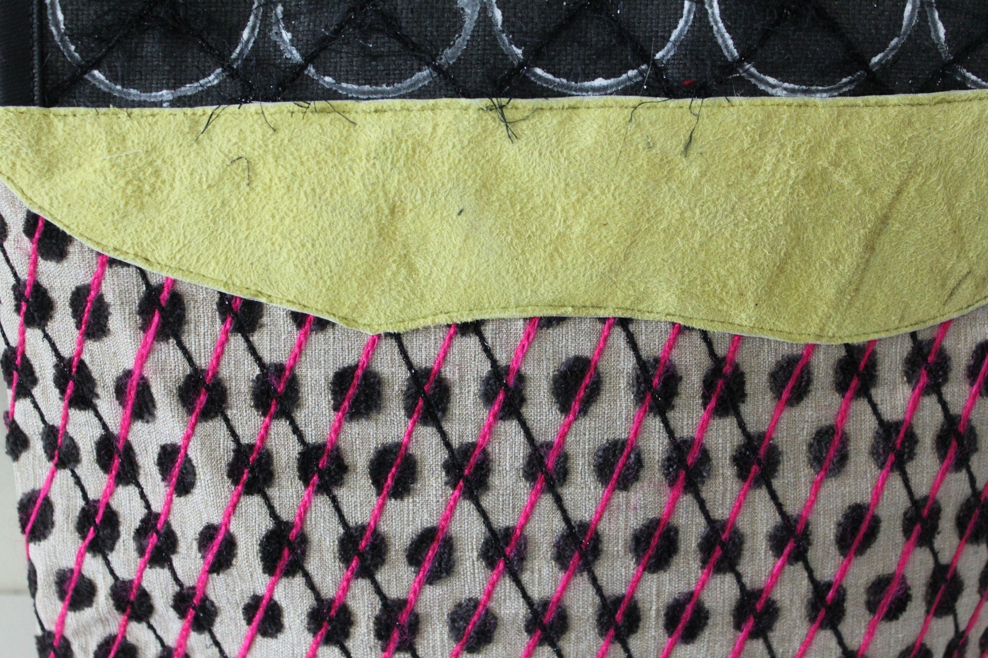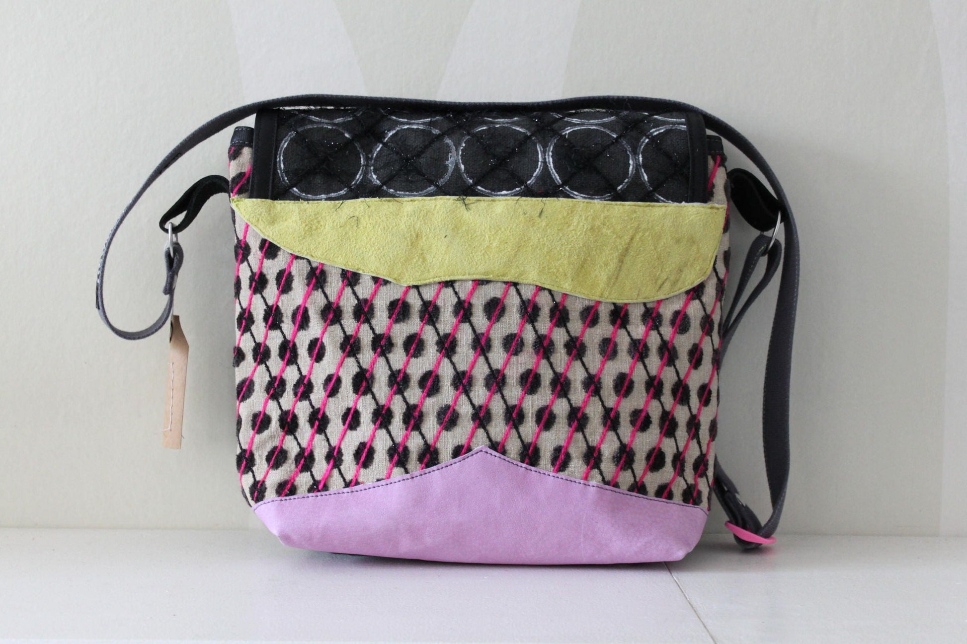 Tas van spijkerstof en stukken leer. Spijkerstof is doorgestikt en bedrukt met textielverf. De tas is gevoerd met stof en voorzien van een binnenvak met rits. De bovenkant is afsluitbaar met een rits. Het hengsel is verstelbaar in lengte.