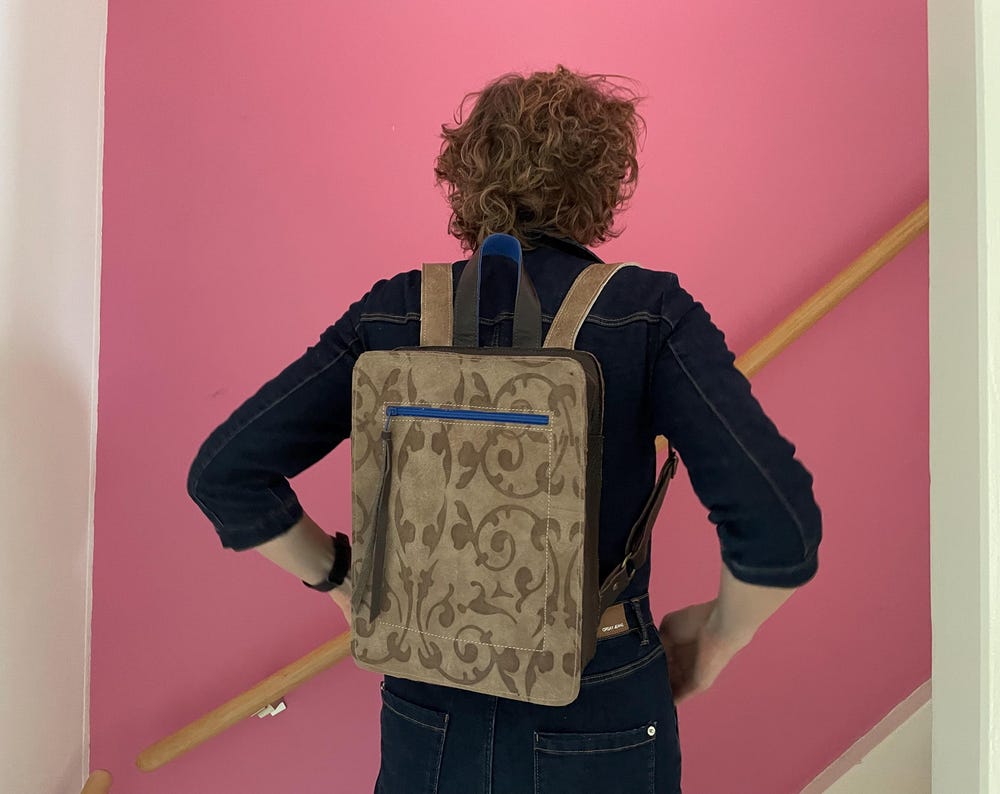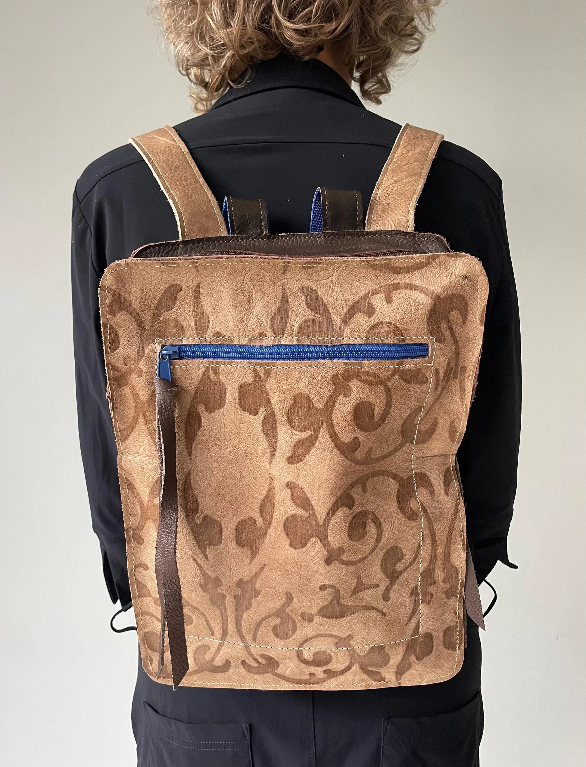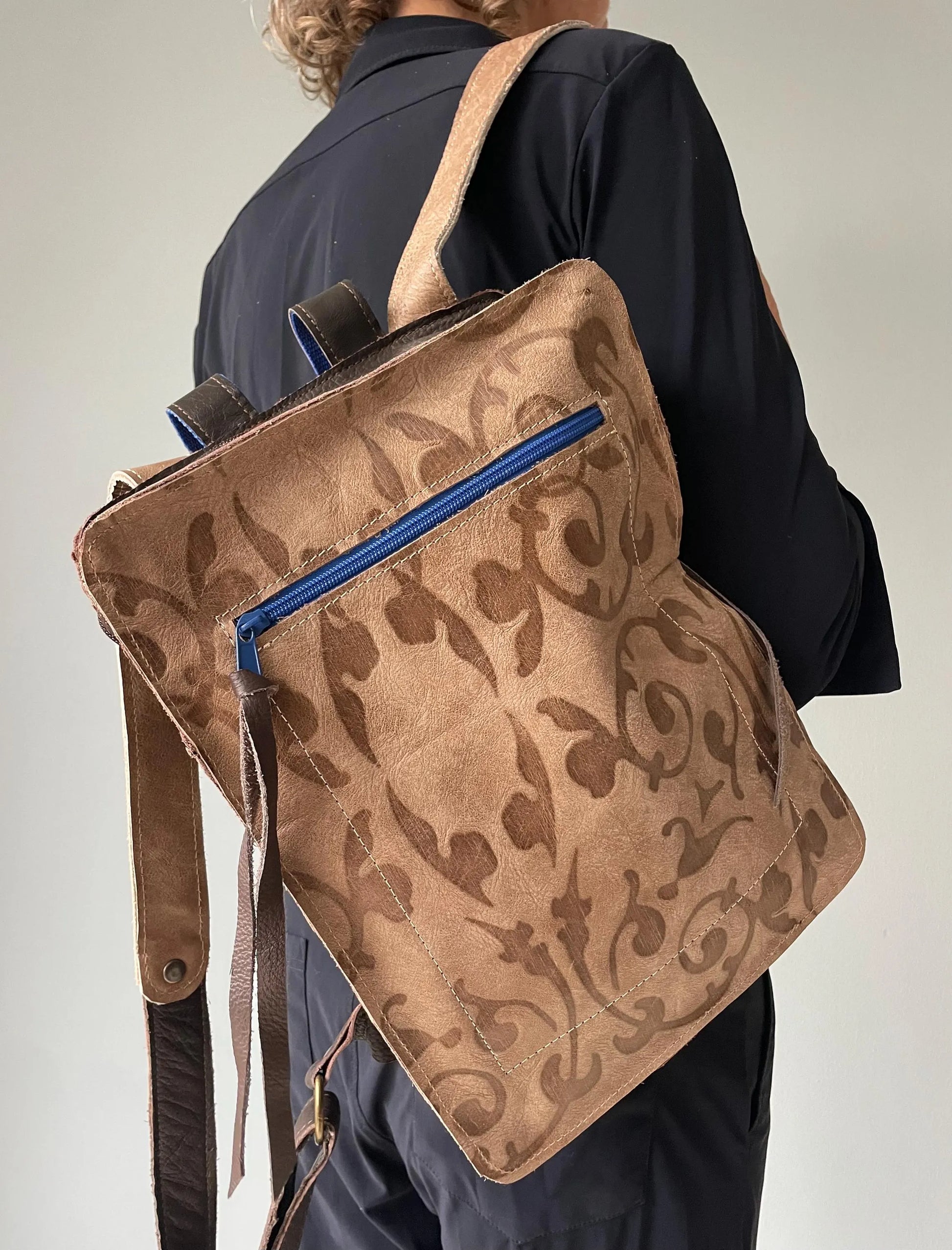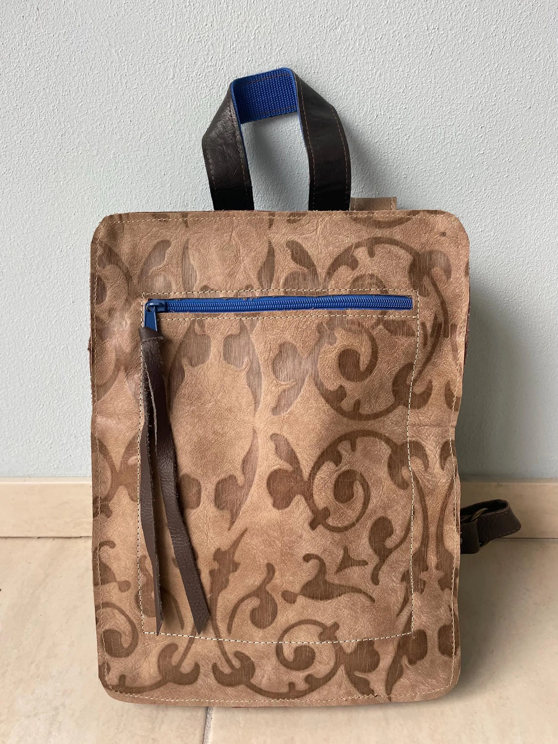 Rugzak gemaakt van donker bruin en lichtbruin leer met motief, afsluitbaar met een bruine rits en voorzien van een voorvak met blauwe rits. The rugzak heeft verstelbare bruin leren riempjes en een klein bruin blauw handhengsel.