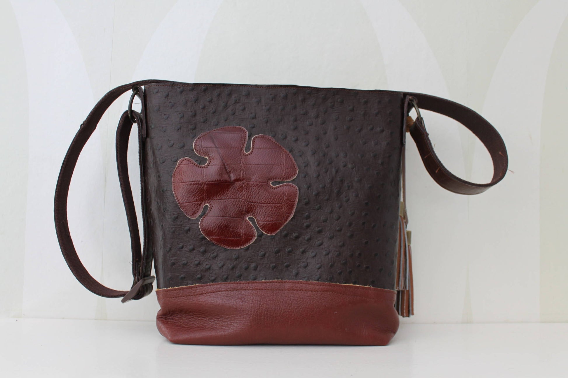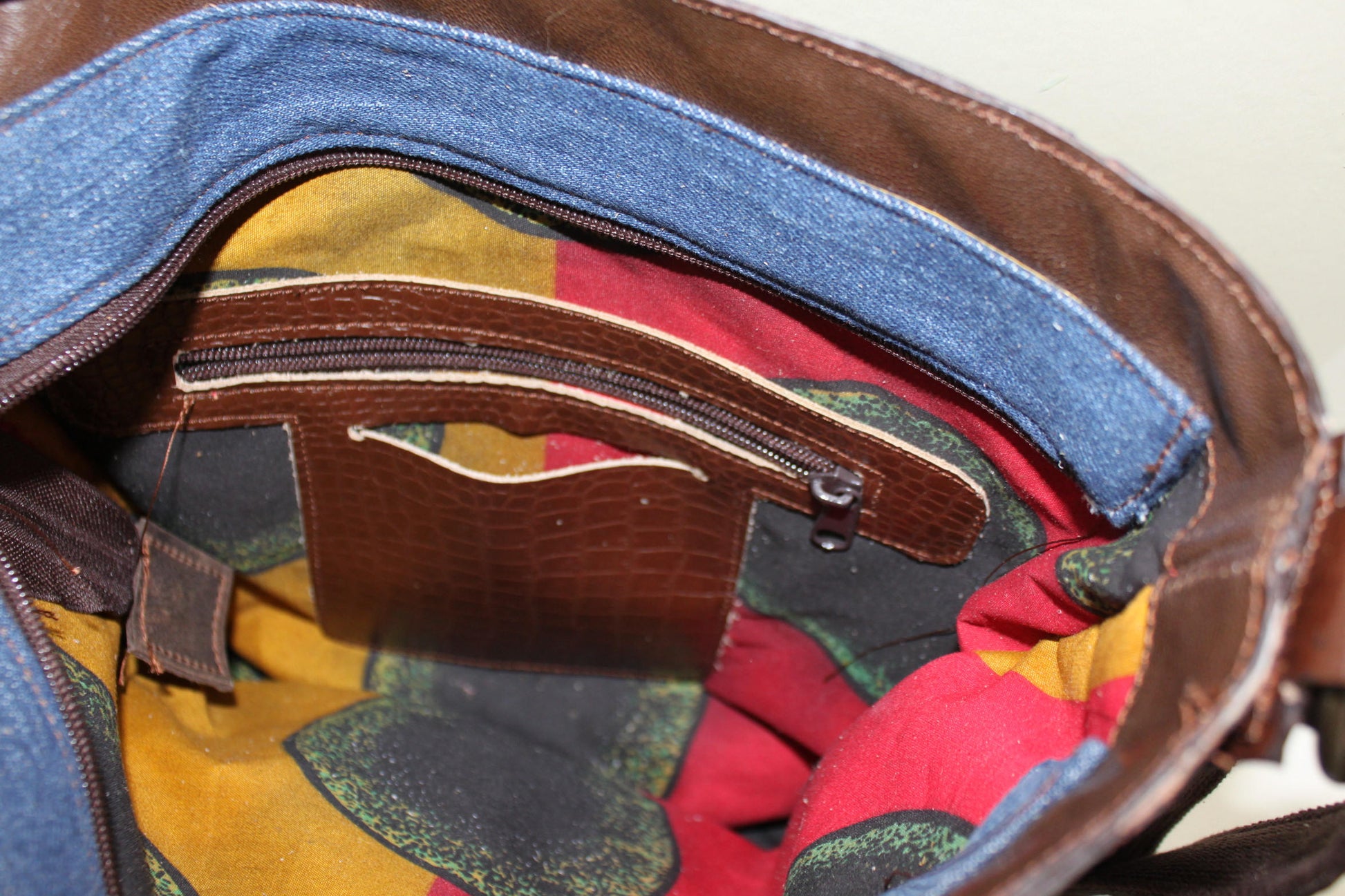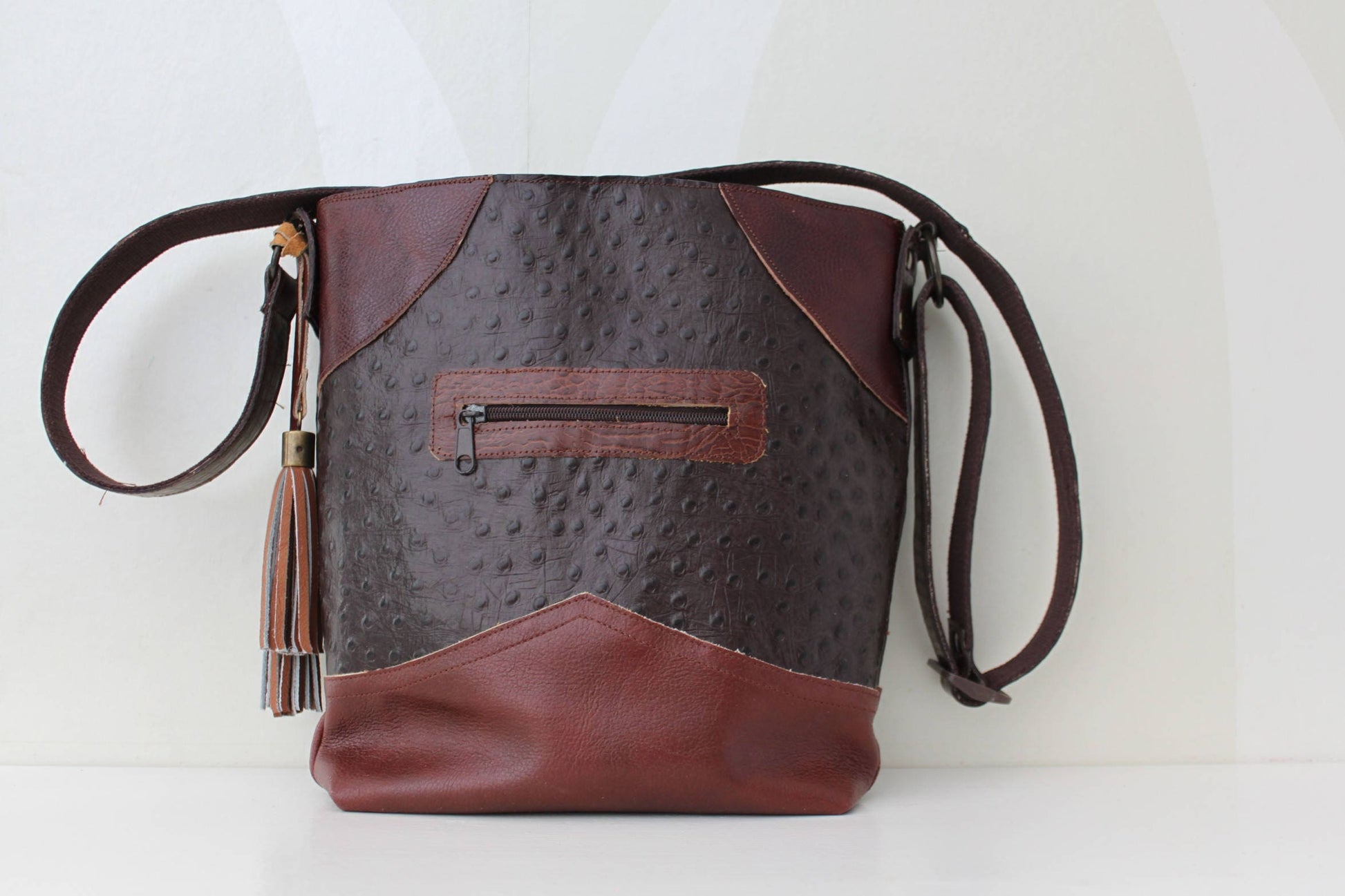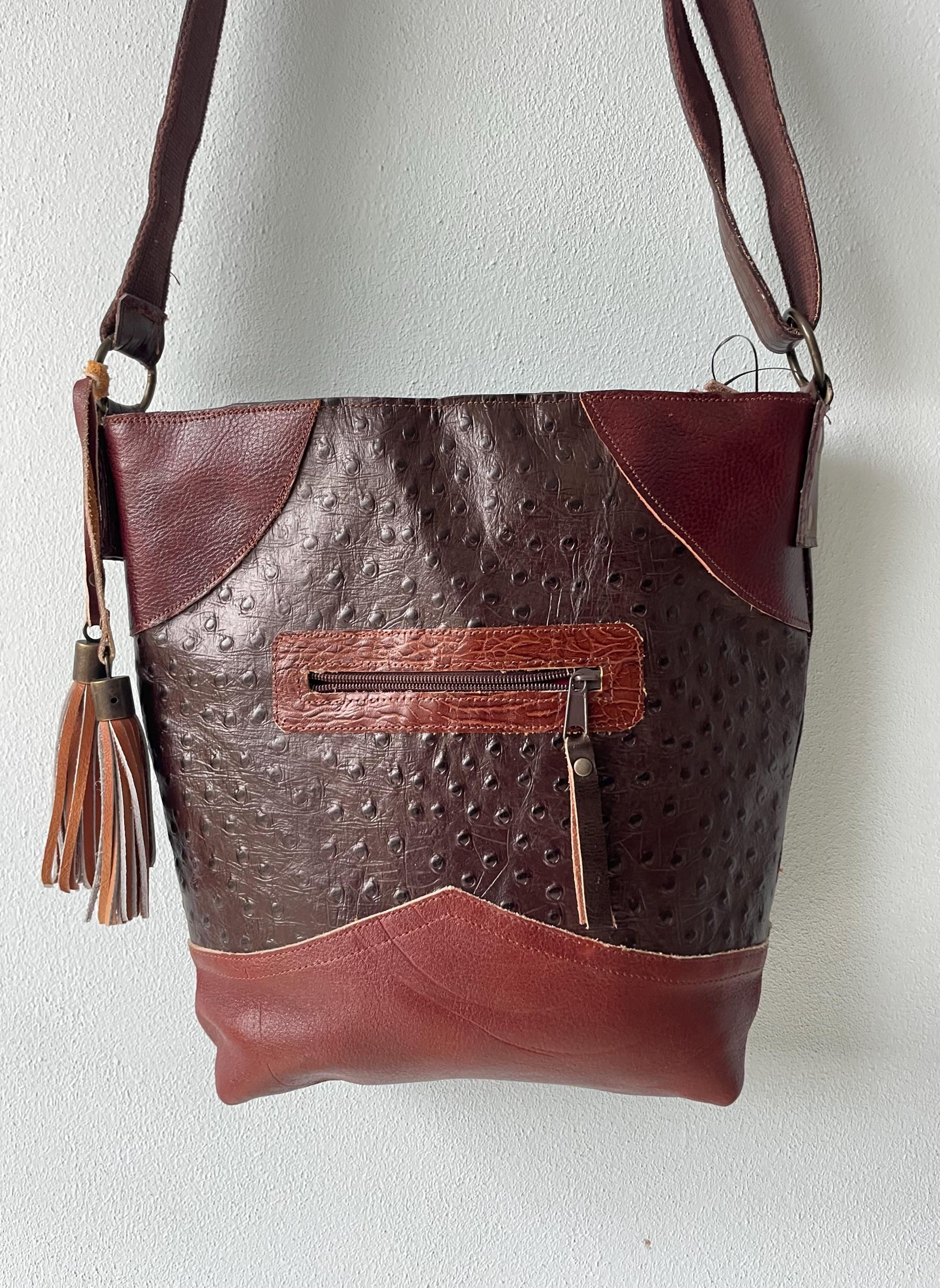 Middelgrote tas van leer met aan de voorzijde een vakje met een rits. De tas heeft een verstelbaar hengsel, is afsluitbaar met een rits, gevoerd met stof en voorzien van een binnenvak met rits.