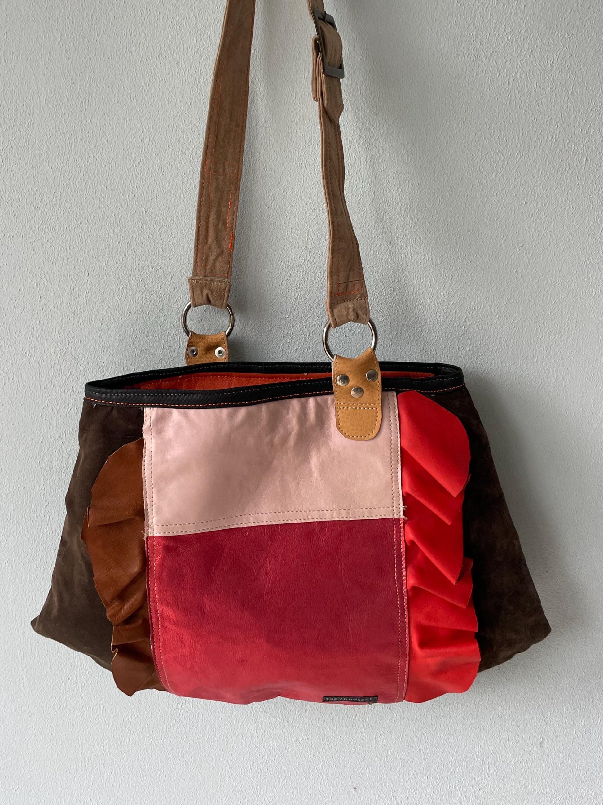 Grote patchwork tas van suede leer en stof. De tas is afsluitbaar met een rits en is voorzien van een binnentasje met rits. Verstelbaar leren hengsel van 90 cm.