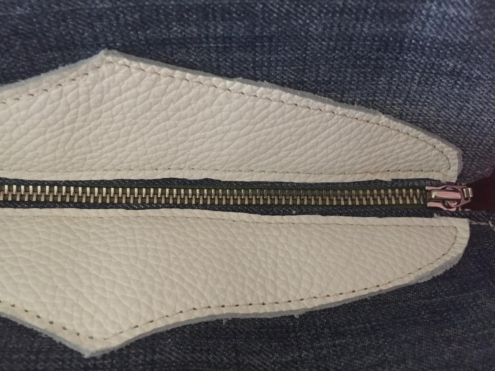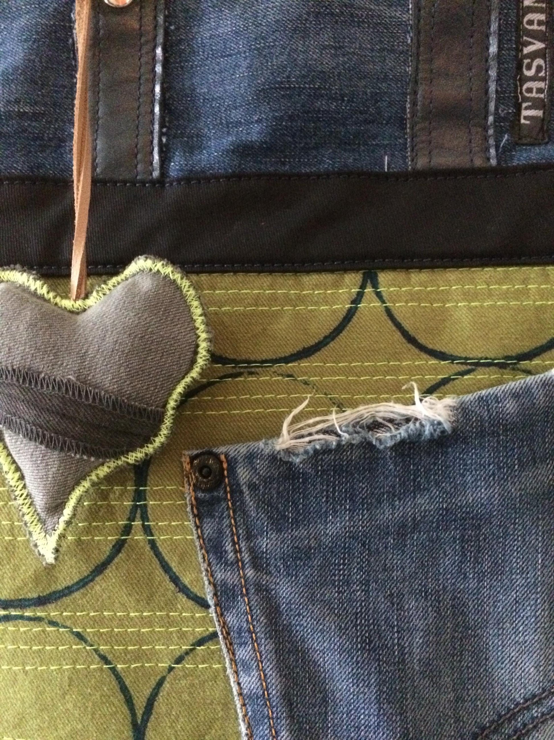 Ruime shopper van denim deels doorgestikt en bedrukt met textielverf. De tas is gevoerd met roze stof met bloemmotief en voorzien van een binnenvak met rits. De bovenkant is afsluitbaar met een rits waarbij de rits is afgezet op een denim strook voorzien van twee witte stukken leer.