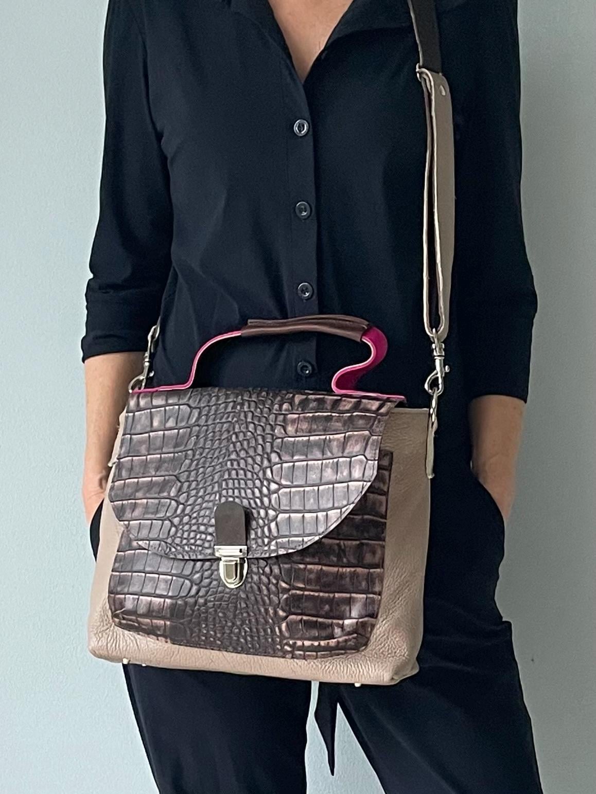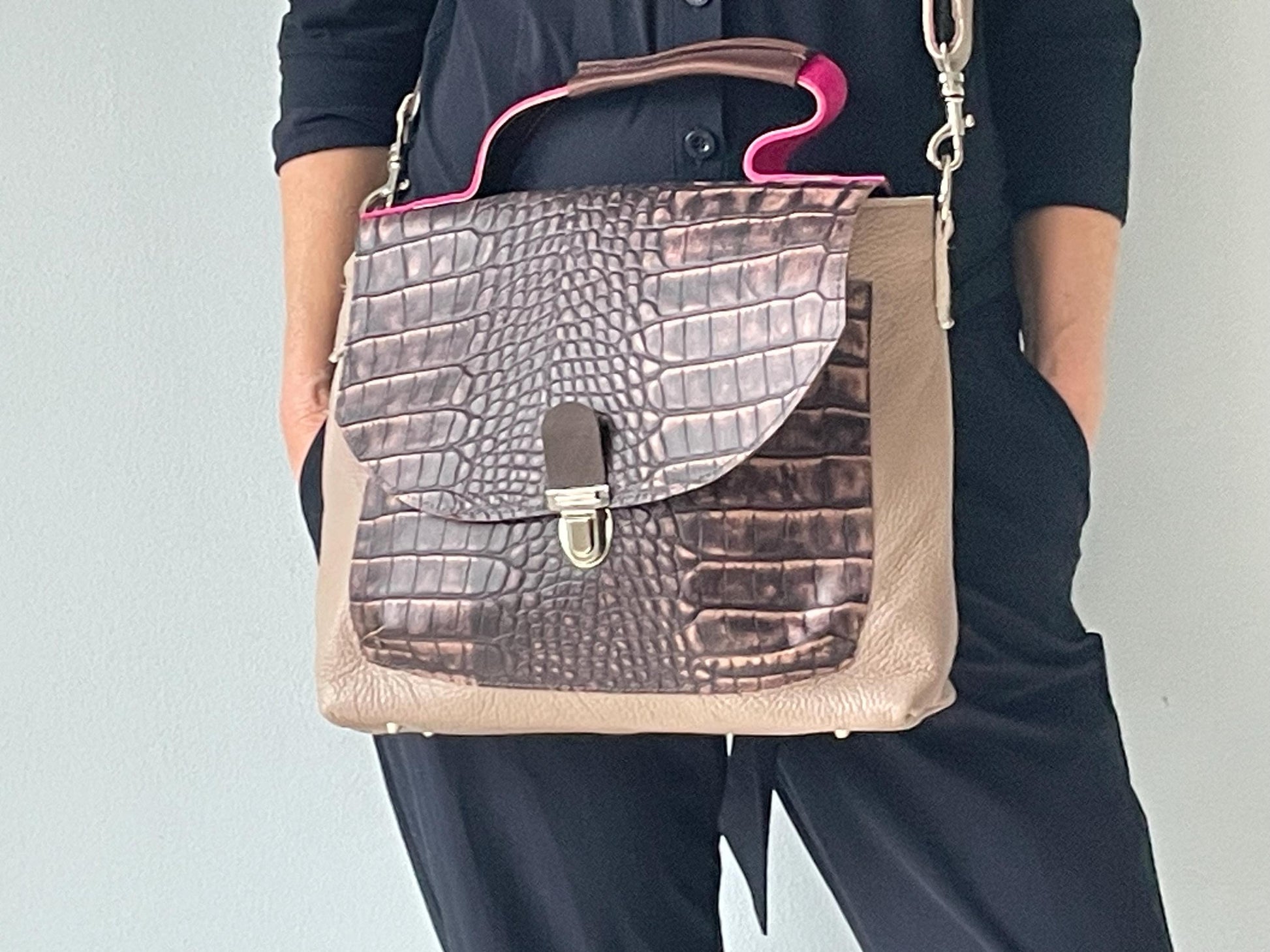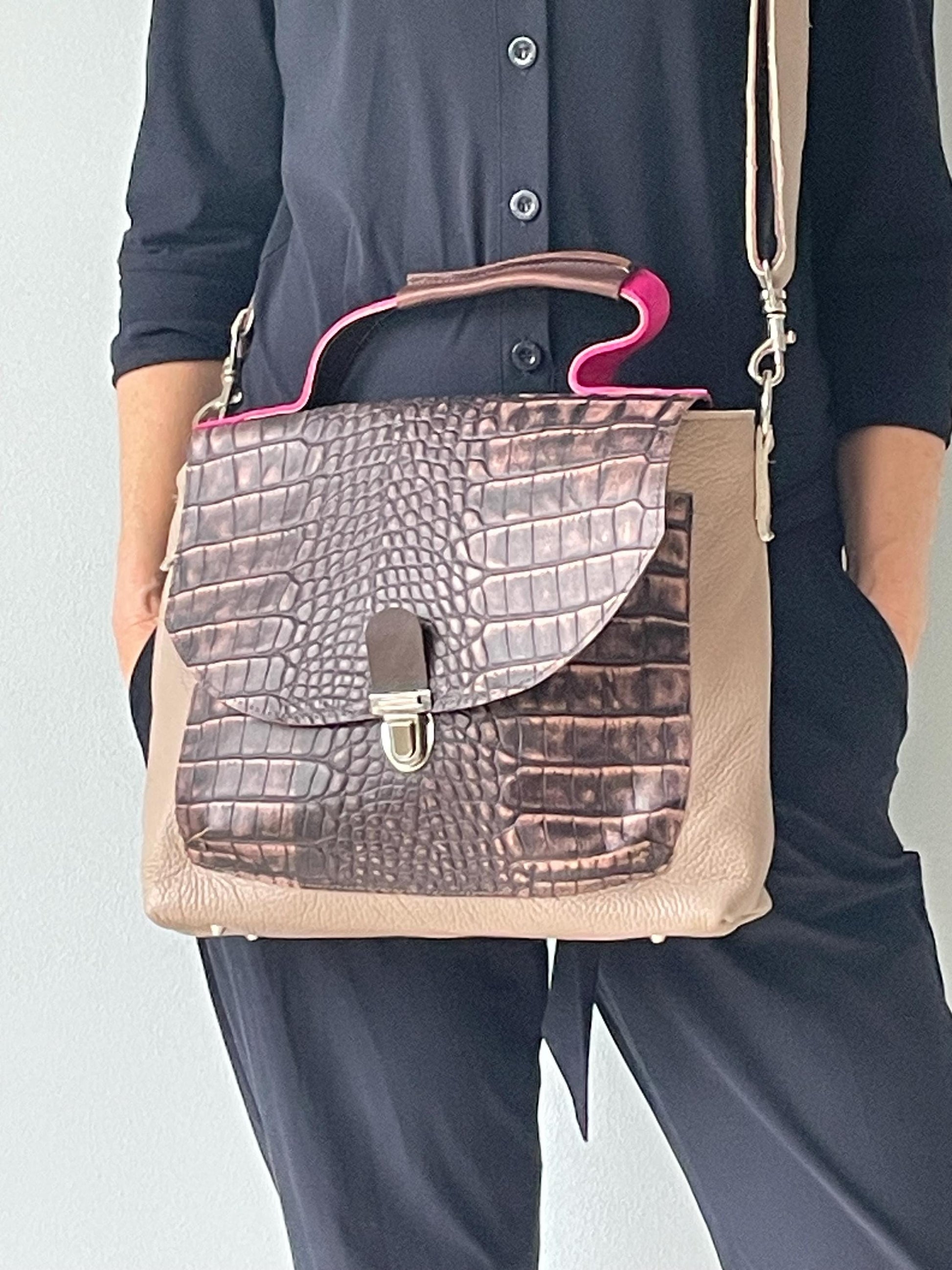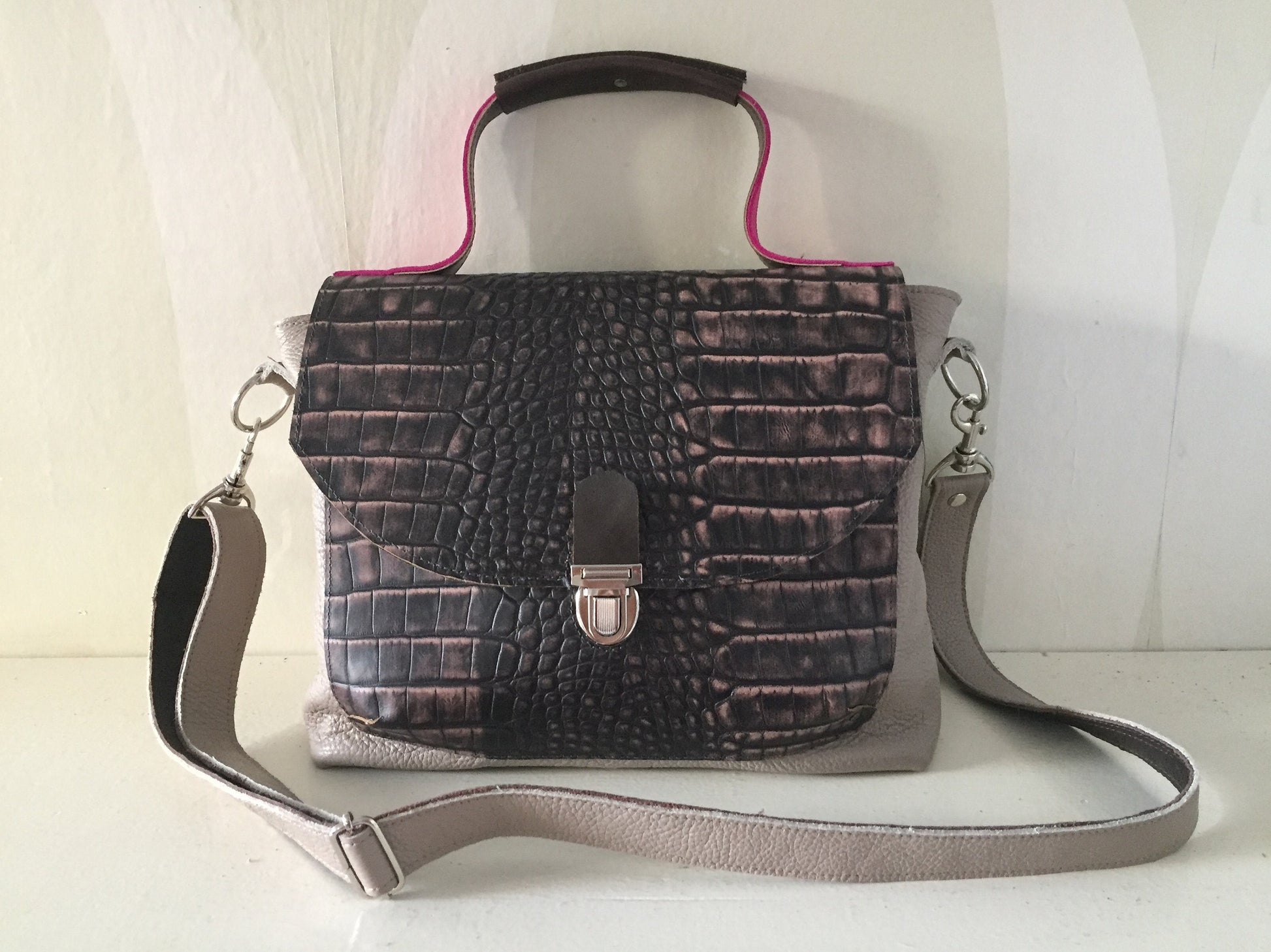 Schoudertas van leer met klep en voorzien van een opgestikt voorvak. De tas heeft een verstelbaar en afneembaar hengsel van 124 cm. De schoudertas is ook als cross body bag en als handtas te gebruiken. De tas heeft een roze leren handhengsel, is kleurrijk gevoerd en is voorzien van een binnenvak met rits.