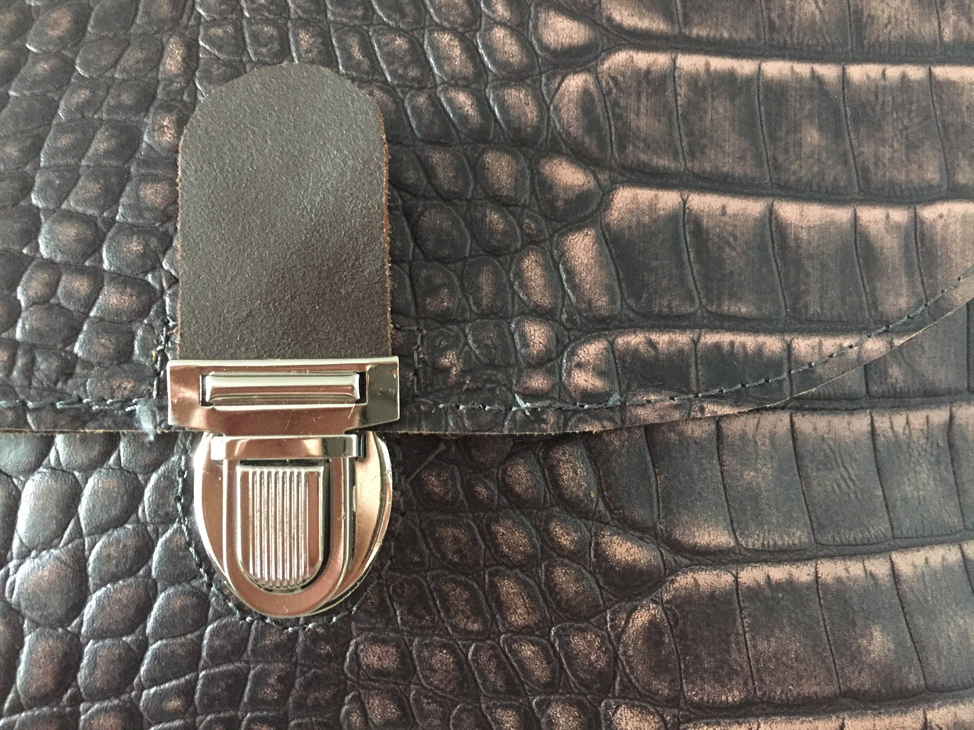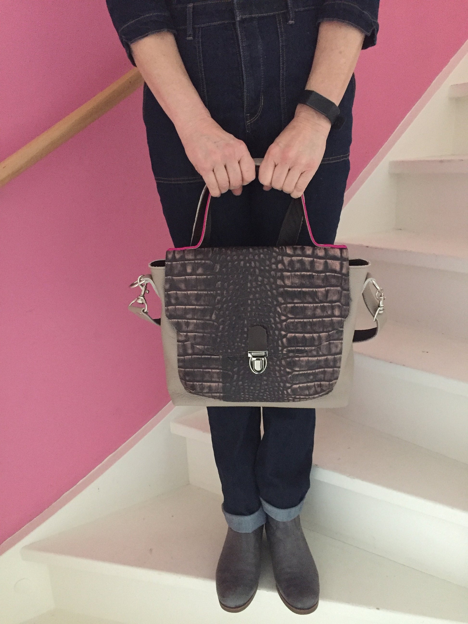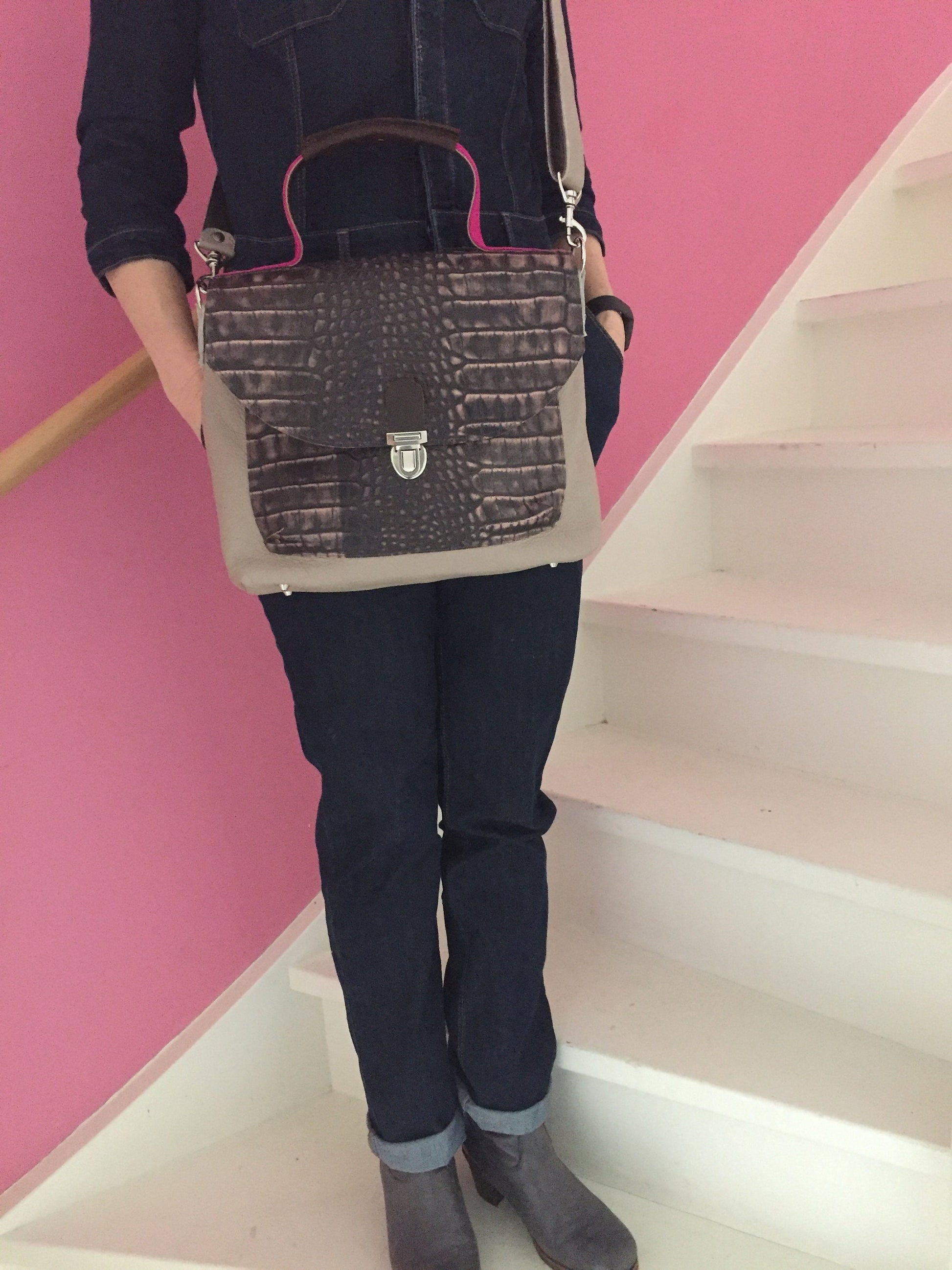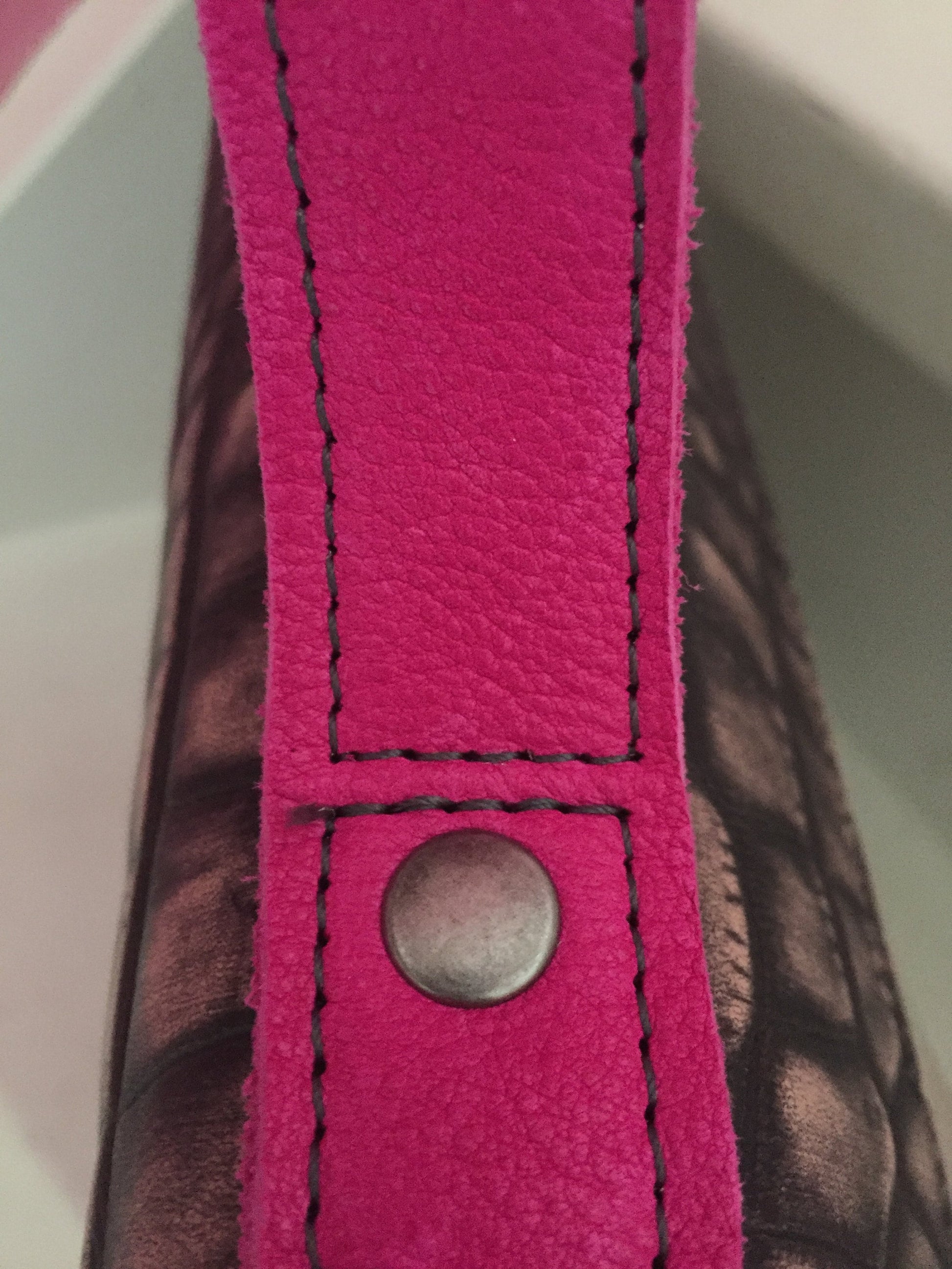 Schoudertas van leer met klep en voorzien van een opgestikt voorvak. De tas heeft een verstelbaar en afneembaar hengsel van 124 cm. De schoudertas is ook als cross body bag en als handtas te gebruiken. De tas heeft een roze leren handhengsel, is kleurrijk gevoerd en is voorzien van een binnenvak met rits.