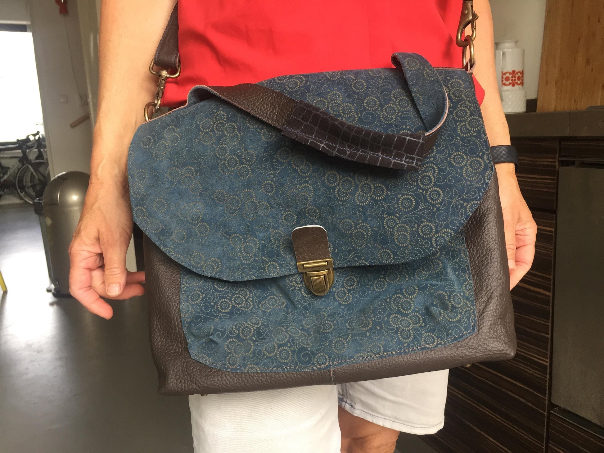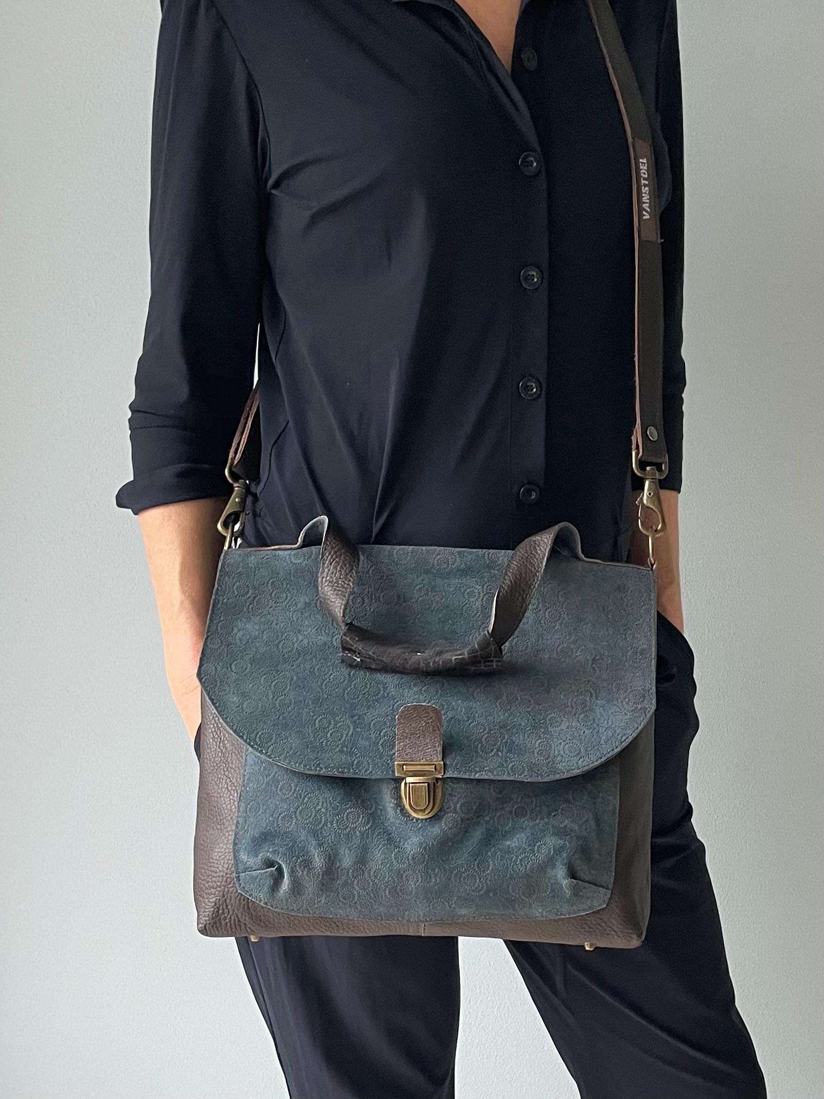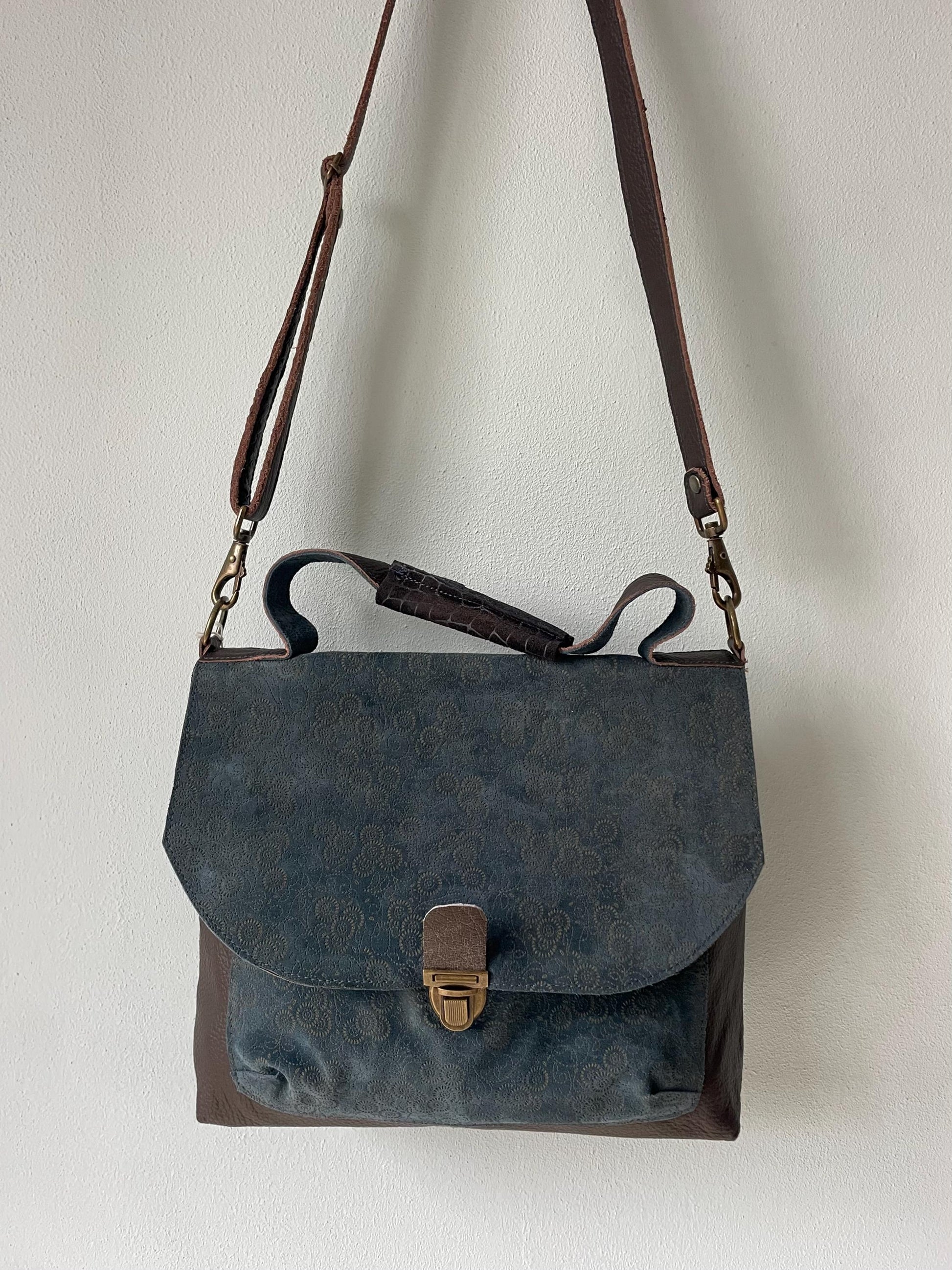 Schoudertas Handtas van Leer met Klep VanStoel#320 BLAUW MOTIEF | Handgemaakt van HERGEBRUIKT leer | duurzaam is beter