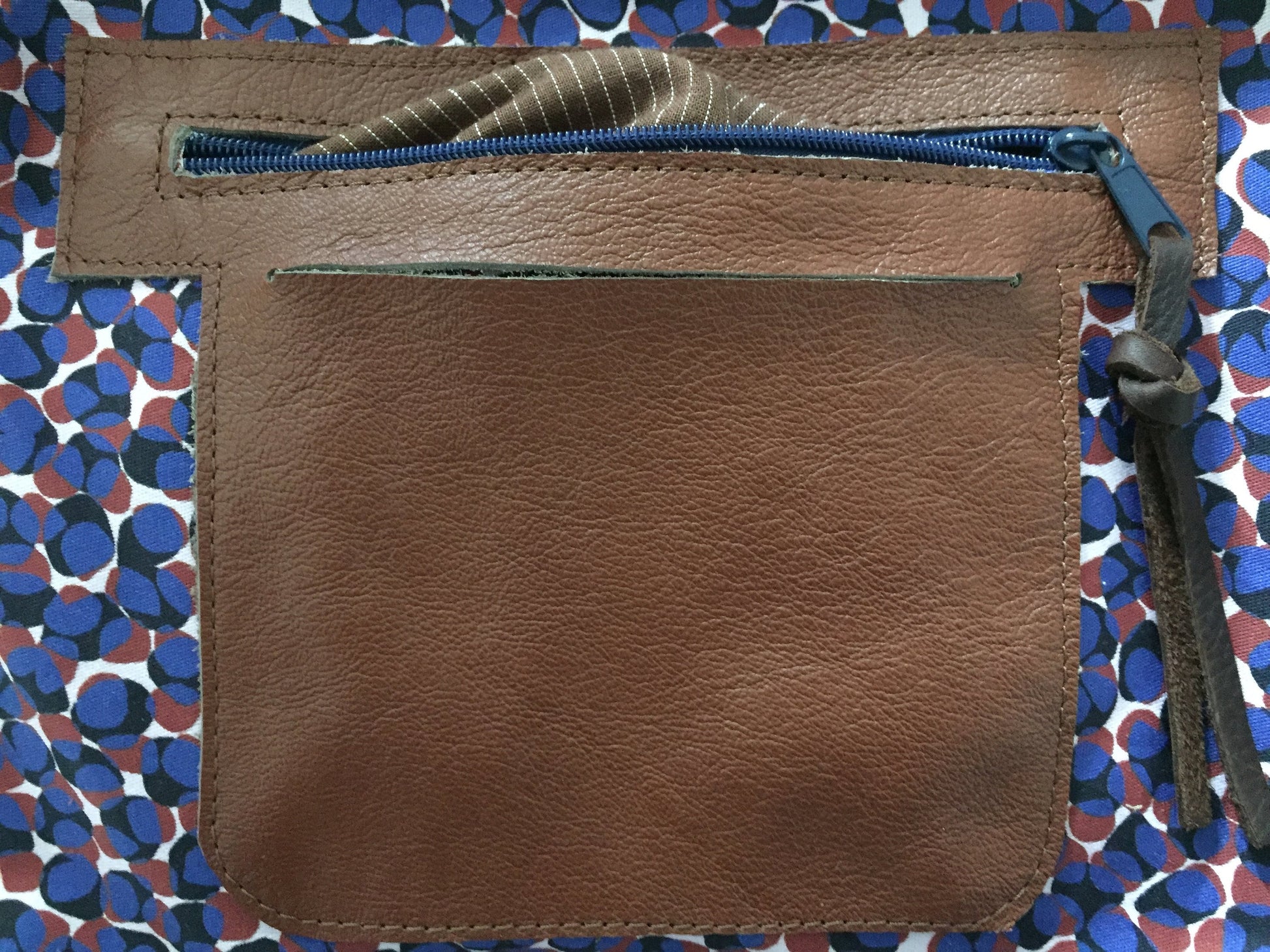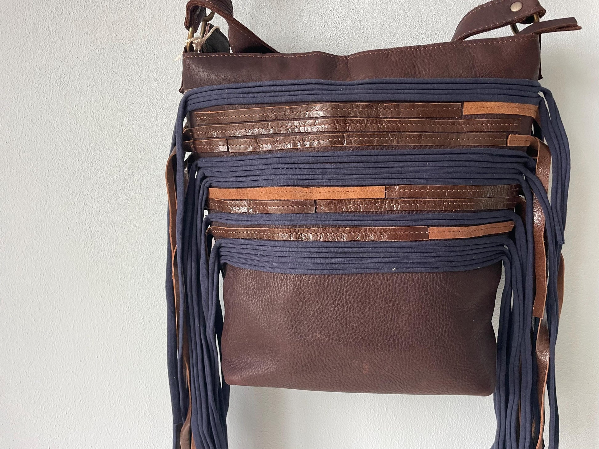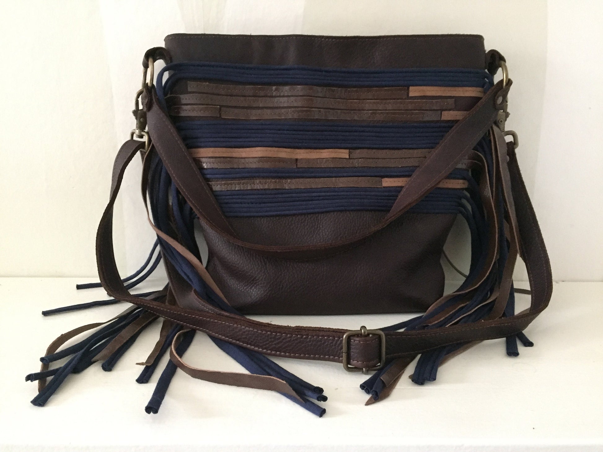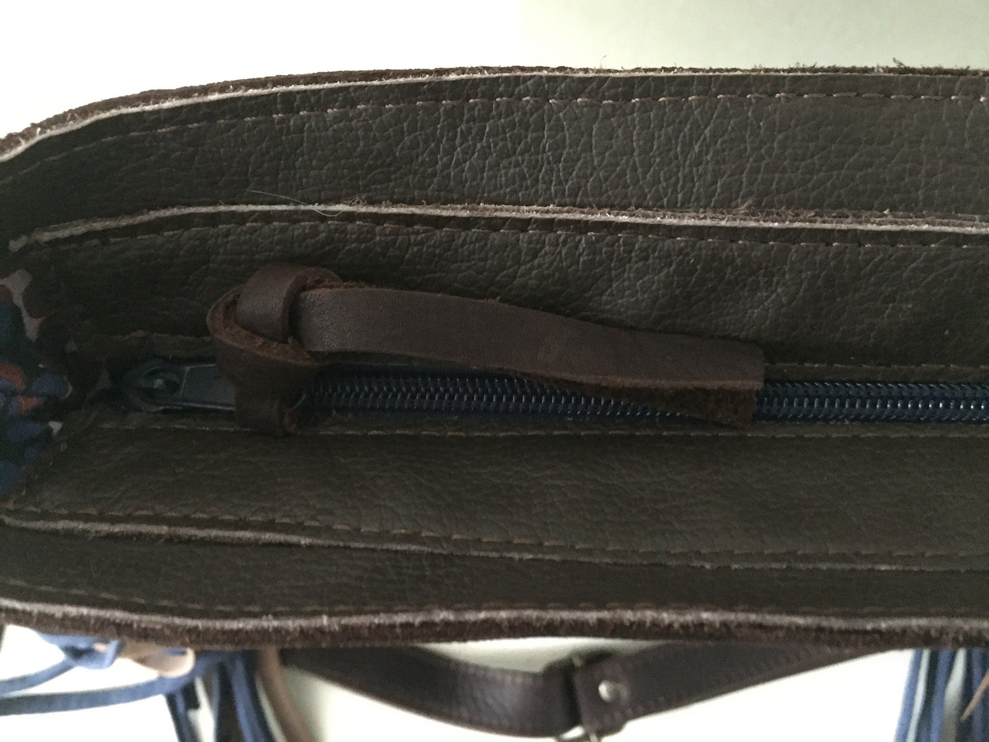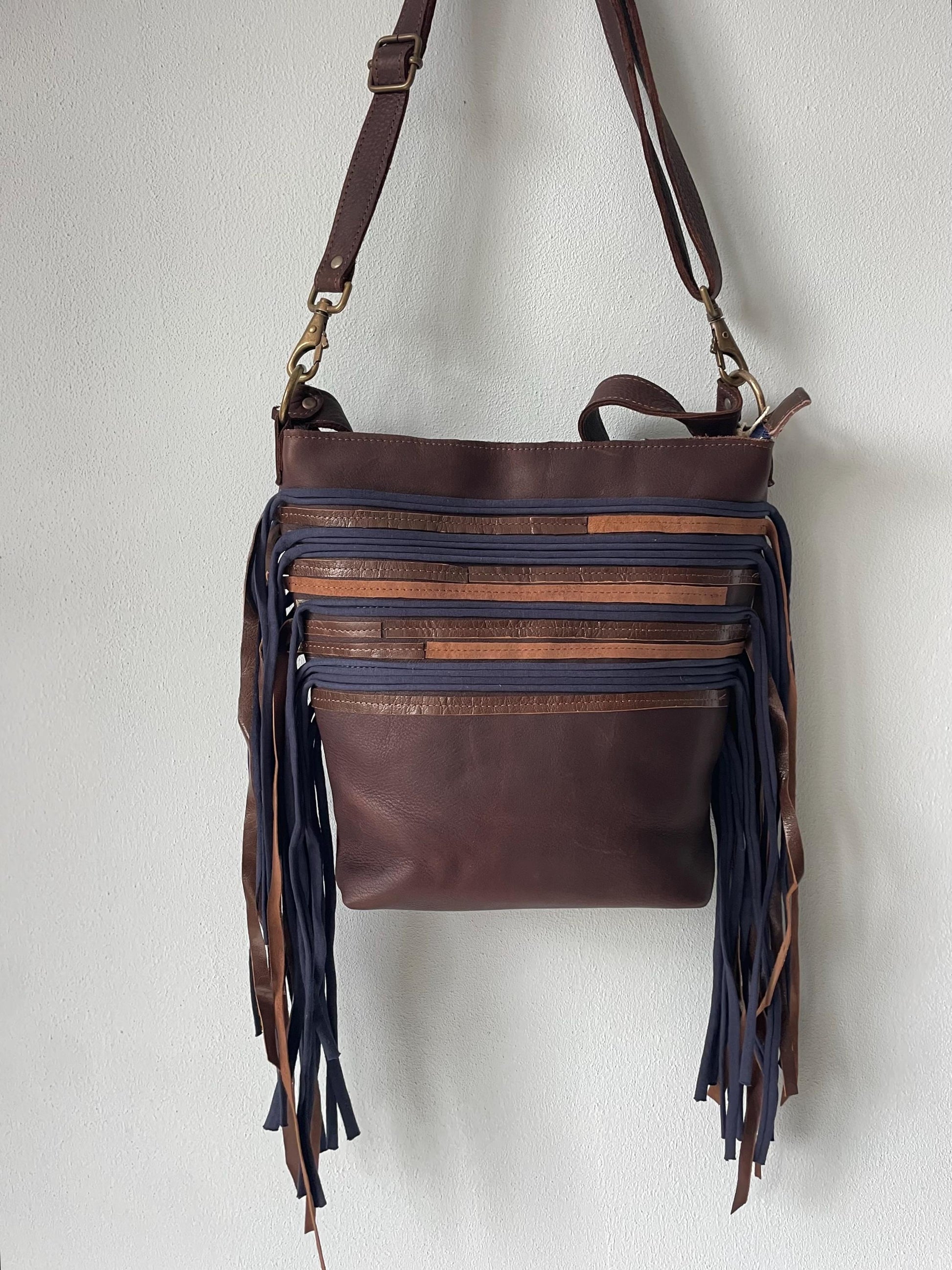 Schoudertas van soepel stevig donker bruin leer. De tas is afsluitbaar met een blauwe rits op een bruine strook leer, heeft een bruin leren vast hengsel van 60 cm en een afneembaar en verstelbaar hengsel van 140 cm. Voorzien van leren franjes. De schoudertas is ook als cross body bag te gebruiken. De tas is kleurrijk gevoerd, voorzien van een binnenvak met rits en een tweetal vakjes voor mobiel en portemonnee.