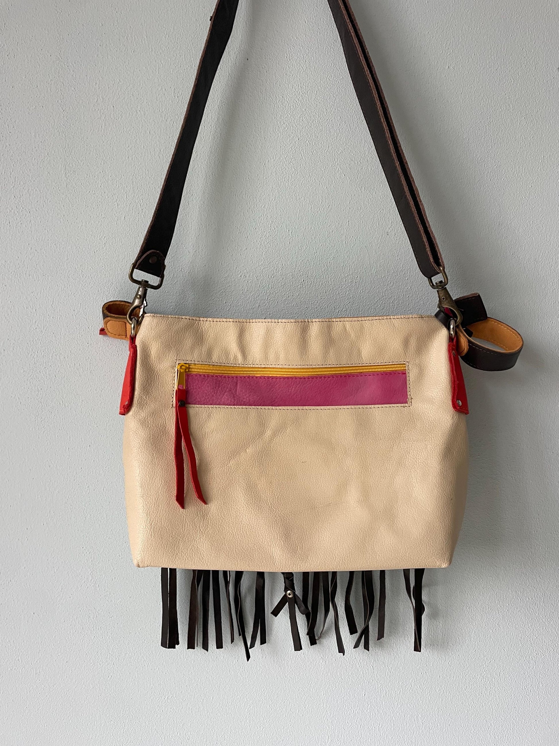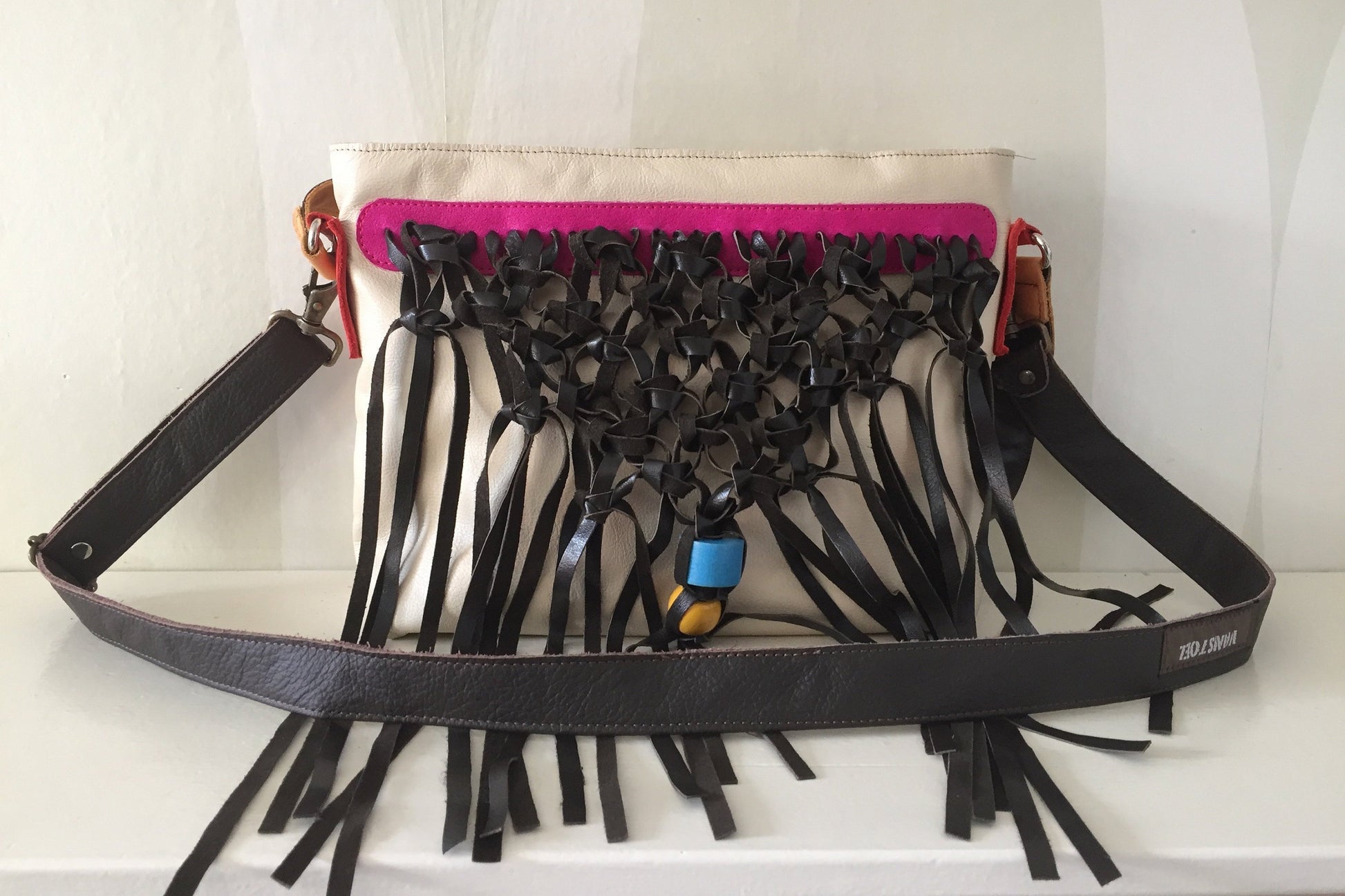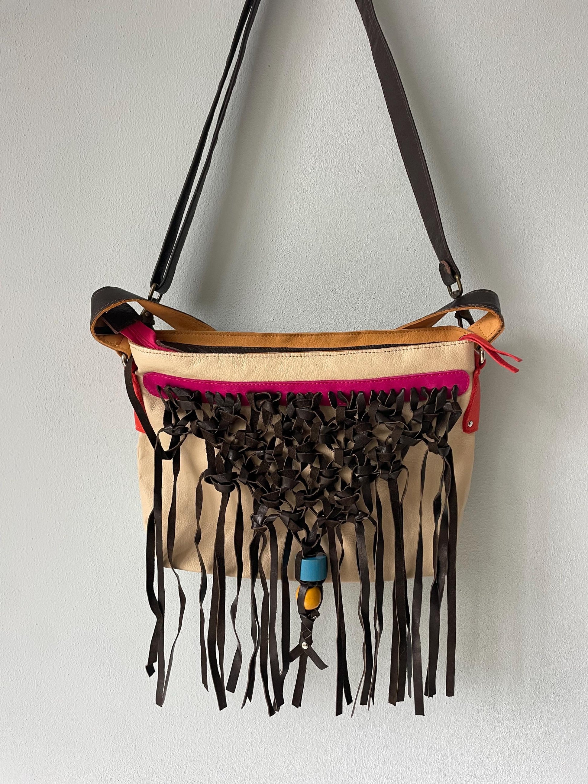 Schoudertas van beige leer met gevlochten leren franjes. Aan de achterzijde zit een vak met gele rits. De tas is afsluitbaar met een roze rits genaaid op een donker bruine strook leer, heeft een leren vast hengsel van 66 cm en een afneembaar en verstelbaar hengsel van 130 cm. De schoudertas is ook als cross body bag te gebruiken. De tas is kleurrijk gevoerd, voorzien van een binnenvak met rits en een tweetal vakjes voor mobiel en portemonnee.