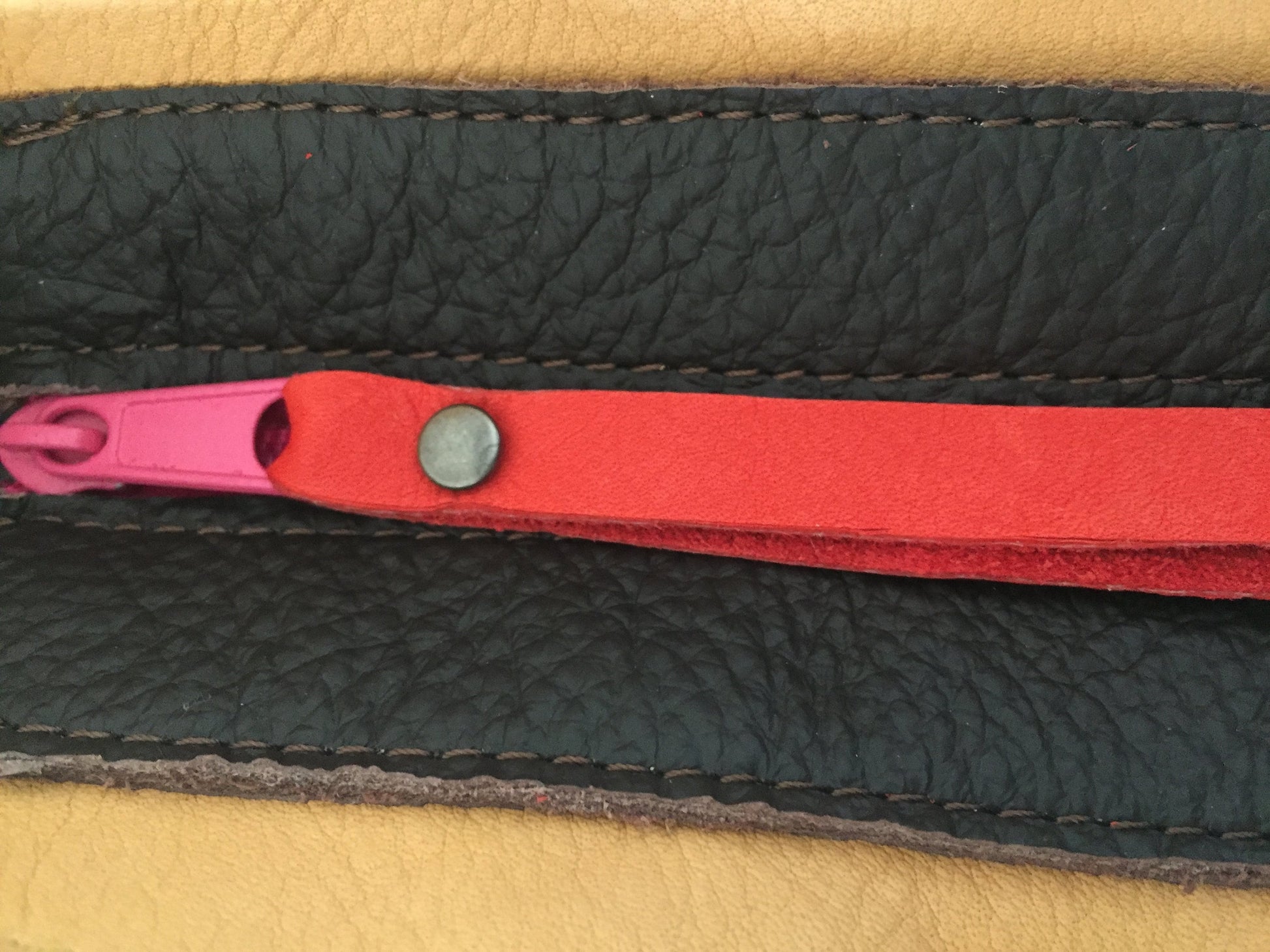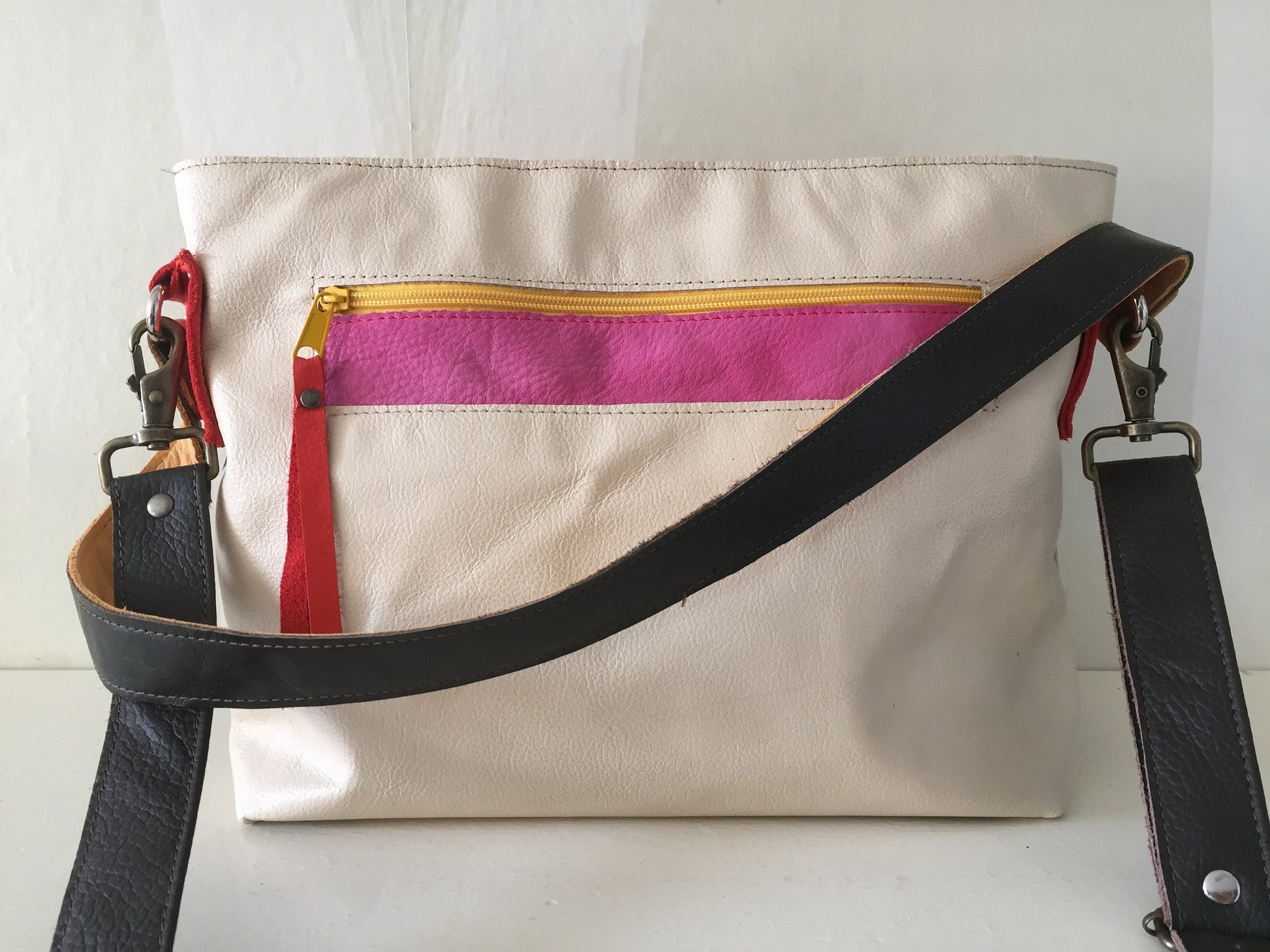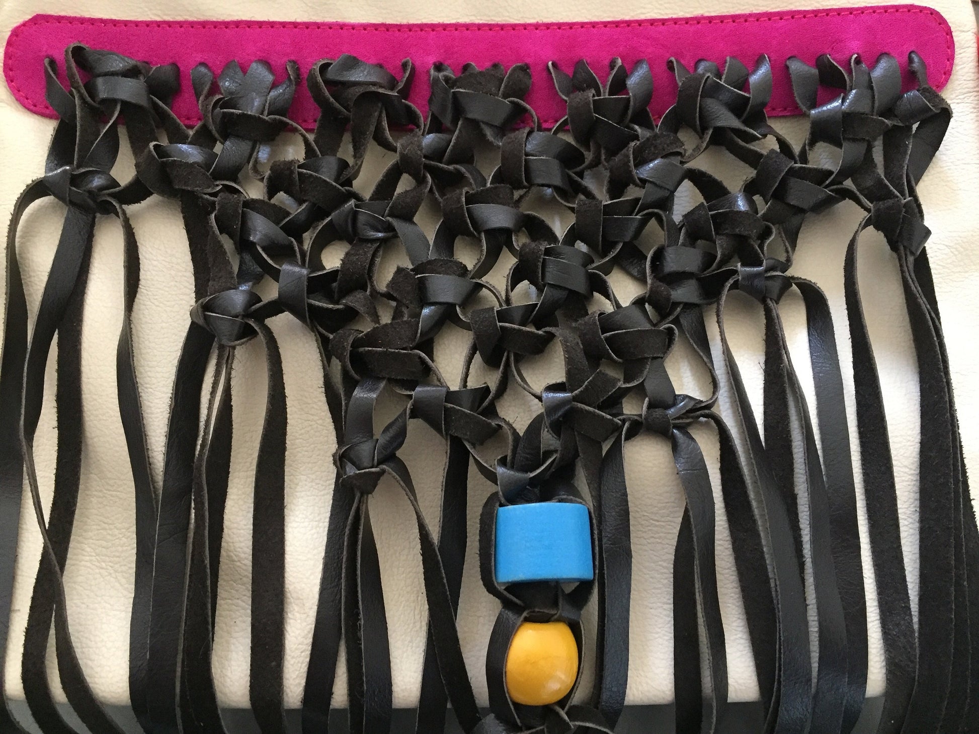 Schoudertas van beige leer met gevlochten leren franjes. Aan de achterzijde zit een vak met gele rits. De tas is afsluitbaar met een roze rits genaaid op een donker bruine strook leer, heeft een leren vast hengsel van 66 cm en een afneembaar en verstelbaar hengsel van 130 cm. De schoudertas is ook als cross body bag te gebruiken. De tas is kleurrijk gevoerd, voorzien van een binnenvak met rits en een tweetal vakjes voor mobiel en portemonnee.