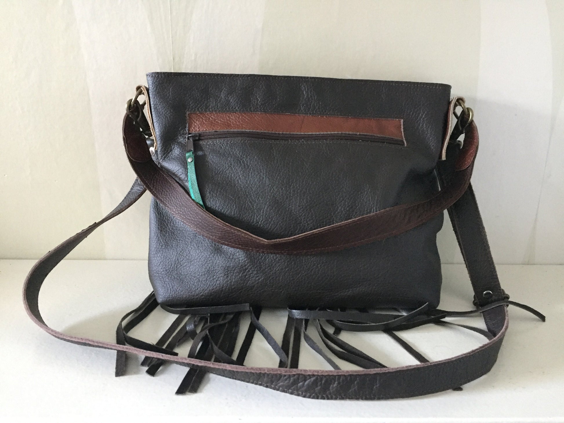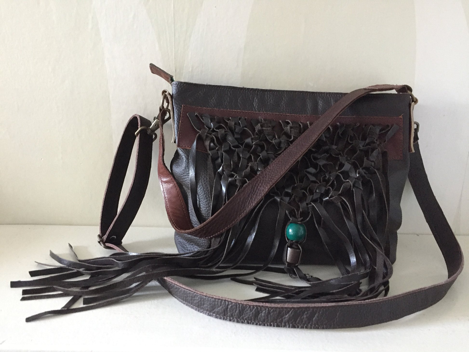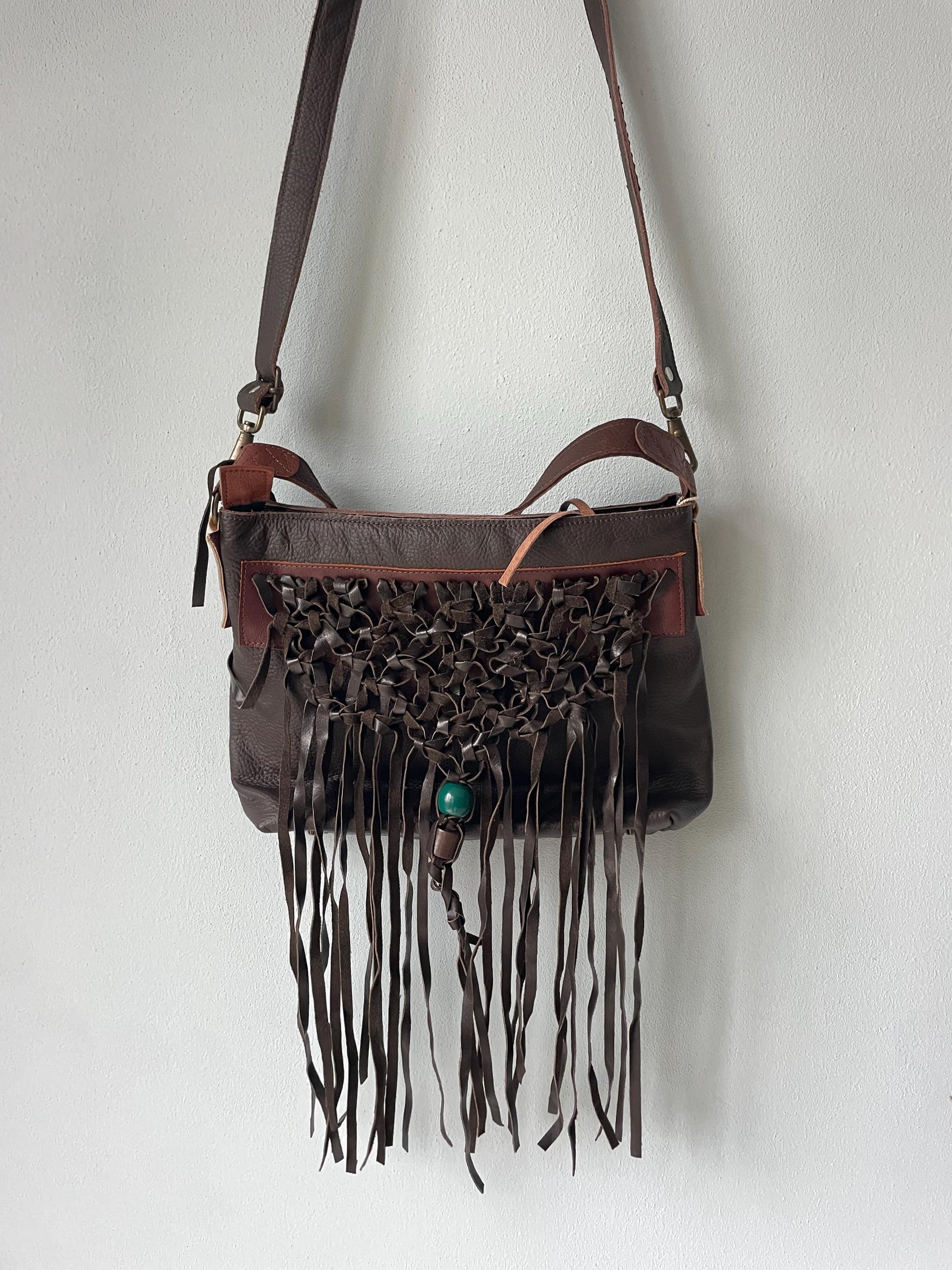 Schoudertas van bruin leer met gevlochten leren franjes. Aan de achterzijde zit een vak met rits. De tas is afsluitbaar met een groene rits, heeft een leren vast hengsel van 60 cm en een afneembaar en verstelbaar hengsel van 136 cm. De schoudertas is ook als cross body bag te gebruiken. De tas is kleurrijk gevoerd, voorzien van een binnenvak met rits en een tweetal vakjes voor mobiel en portemonnee.