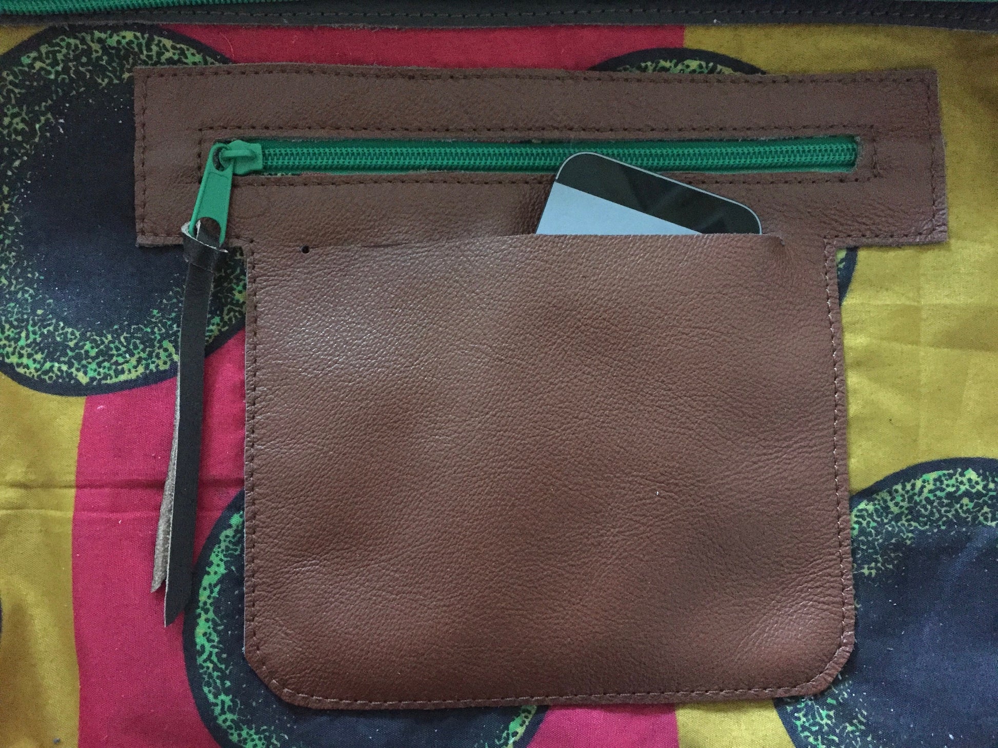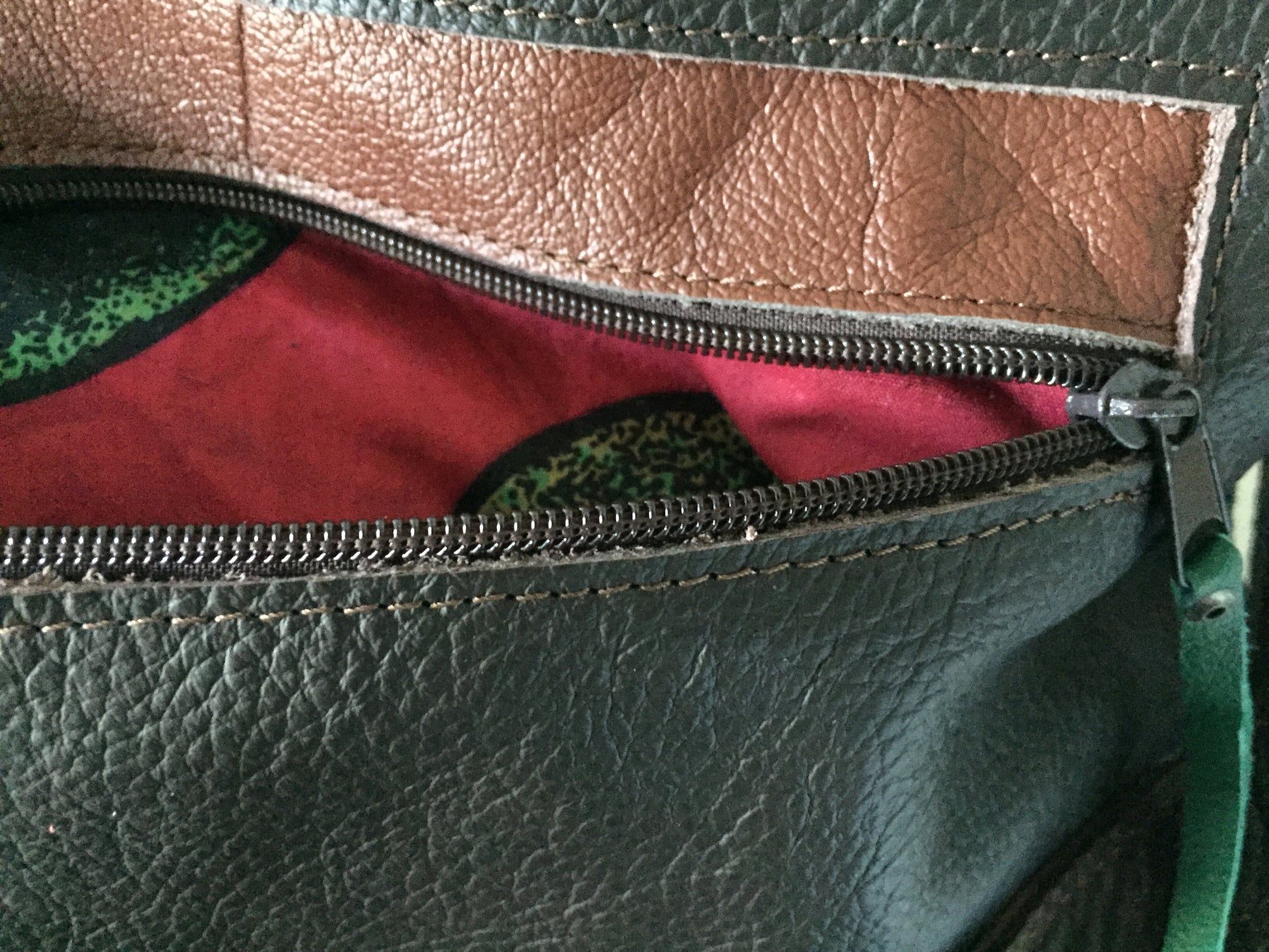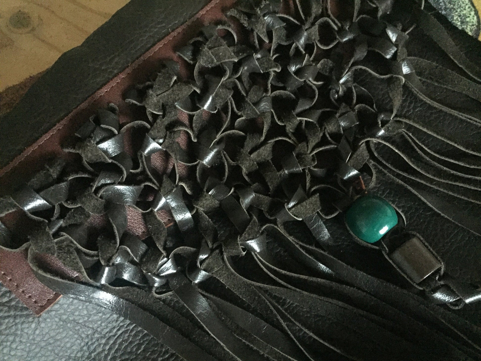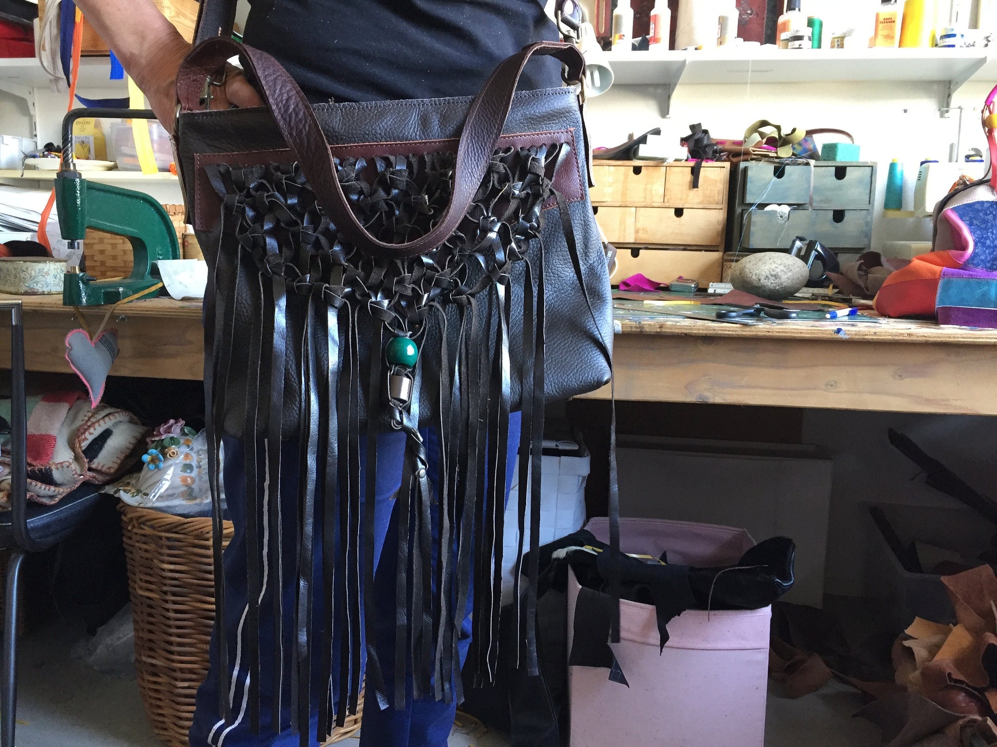 Schoudertas van bruin leer met gevlochten leren franjes. Aan de achterzijde zit een vak met rits. De tas is afsluitbaar met een groene rits, heeft een leren vast hengsel van 60 cm en een afneembaar en verstelbaar hengsel van 136 cm. De schoudertas is ook als cross body bag te gebruiken. De tas is kleurrijk gevoerd, voorzien van een binnenvak met rits en een tweetal vakjes voor mobiel en portemonnee.
