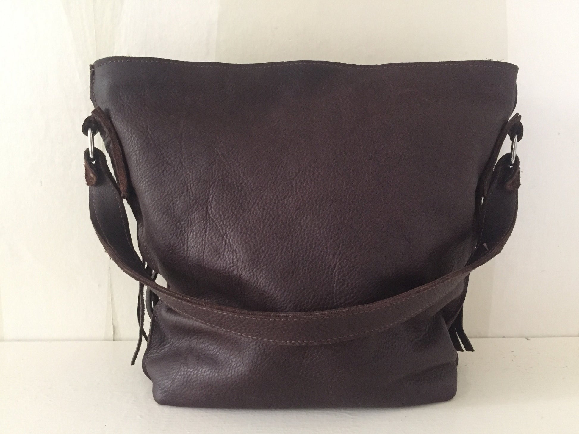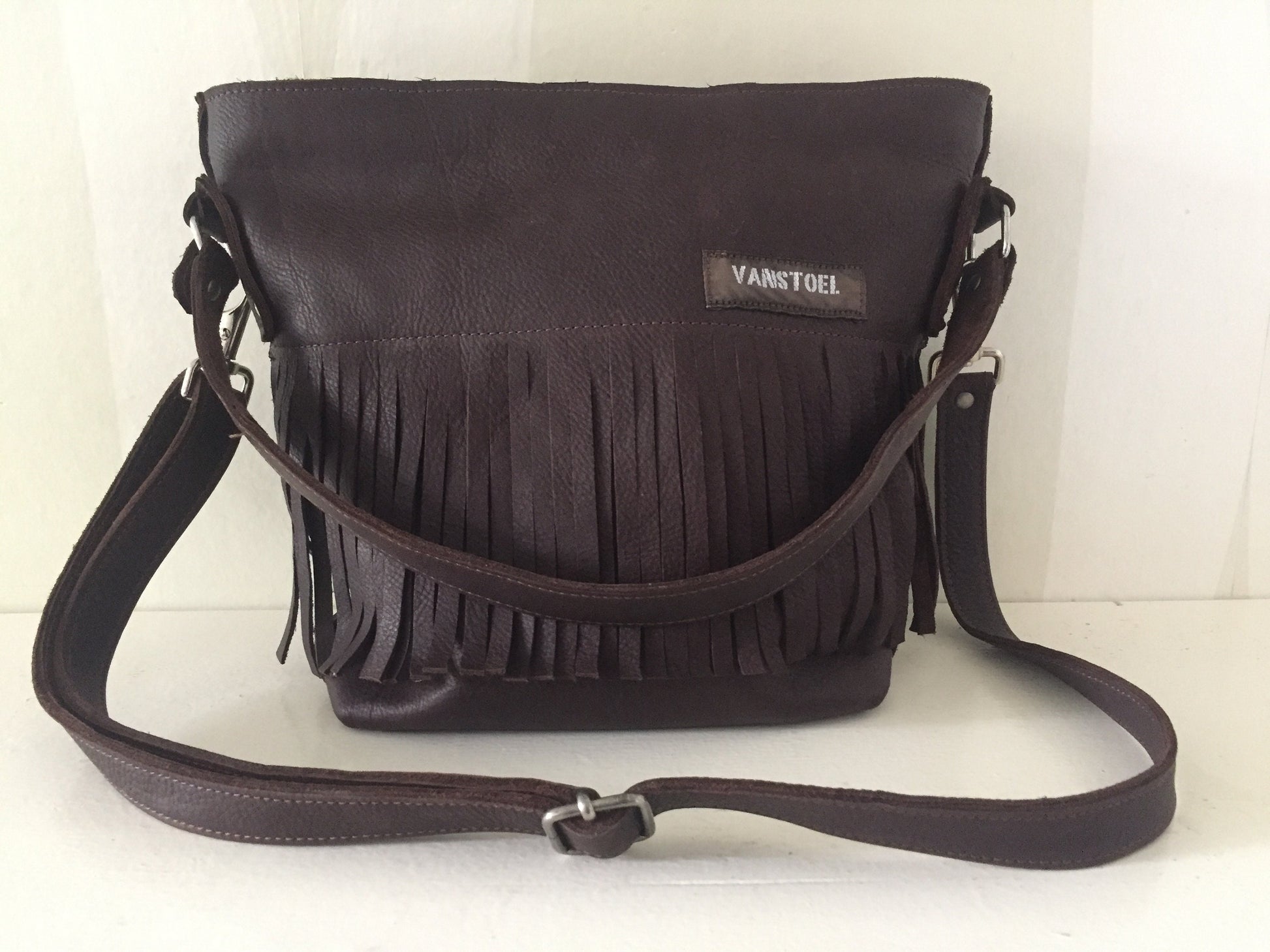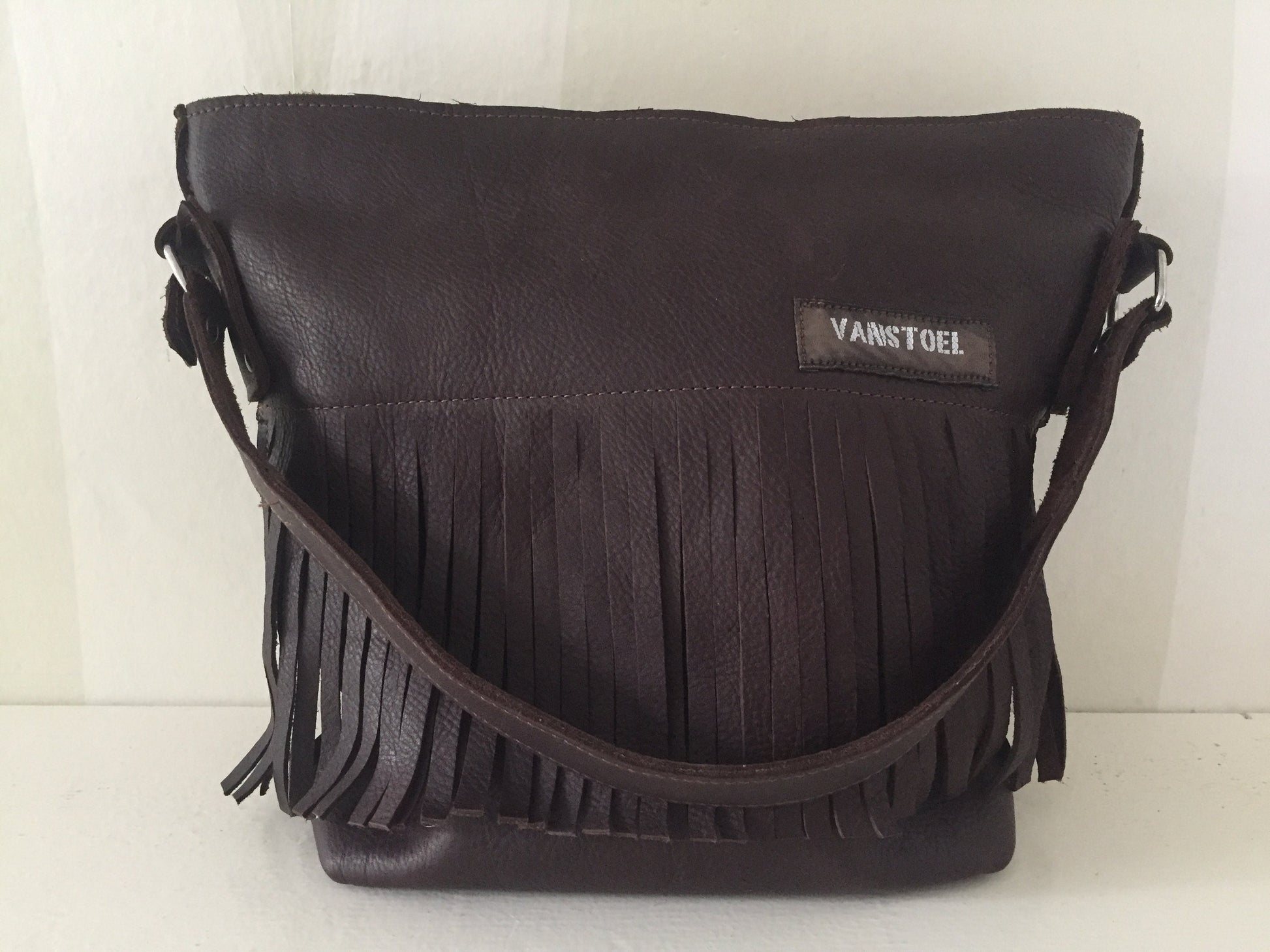 Schoudertas van dik soepel en zacht donker bruin leer met leren franjes. De tas is afsluitbaar met een rits, heeft een lang verstelbaar en afneembaar hengsel en een vast hengsel. De tas is kleurrijk gevoerd, voorzien van een binnenvak met rits en een tweetal vakjes voor mobiel en portemonnee.