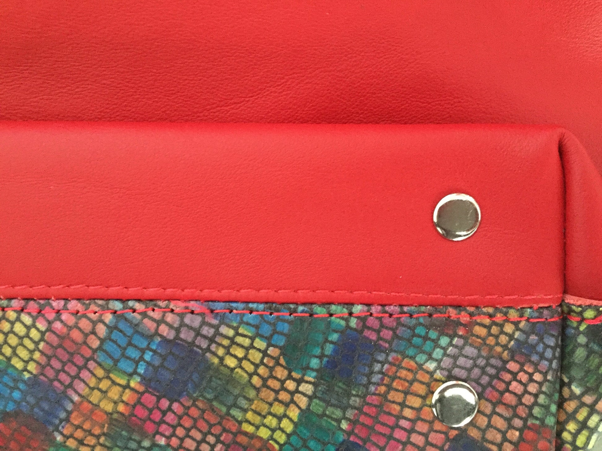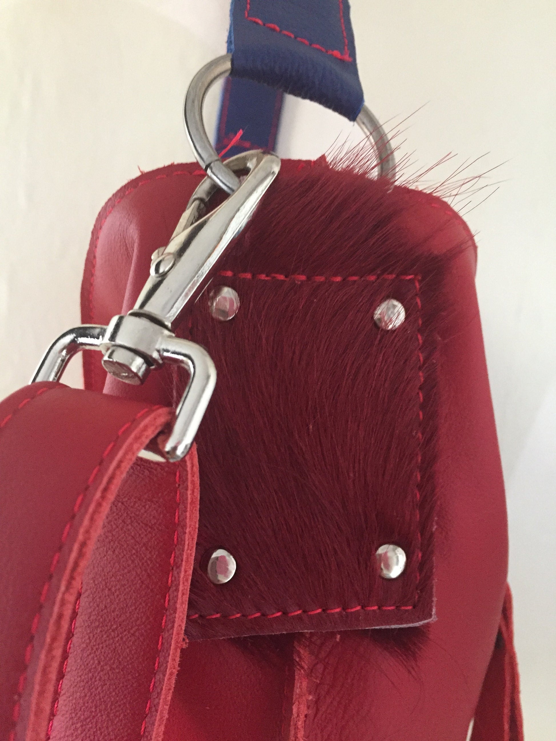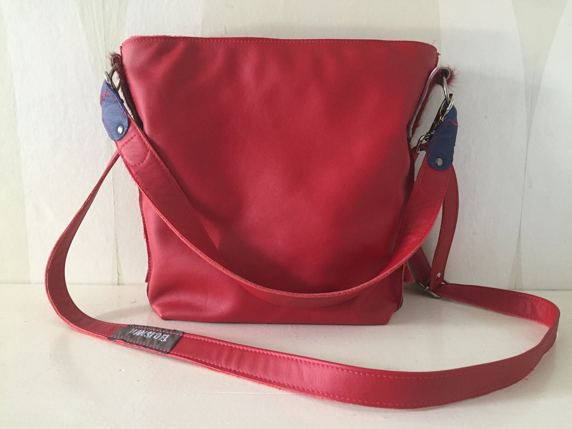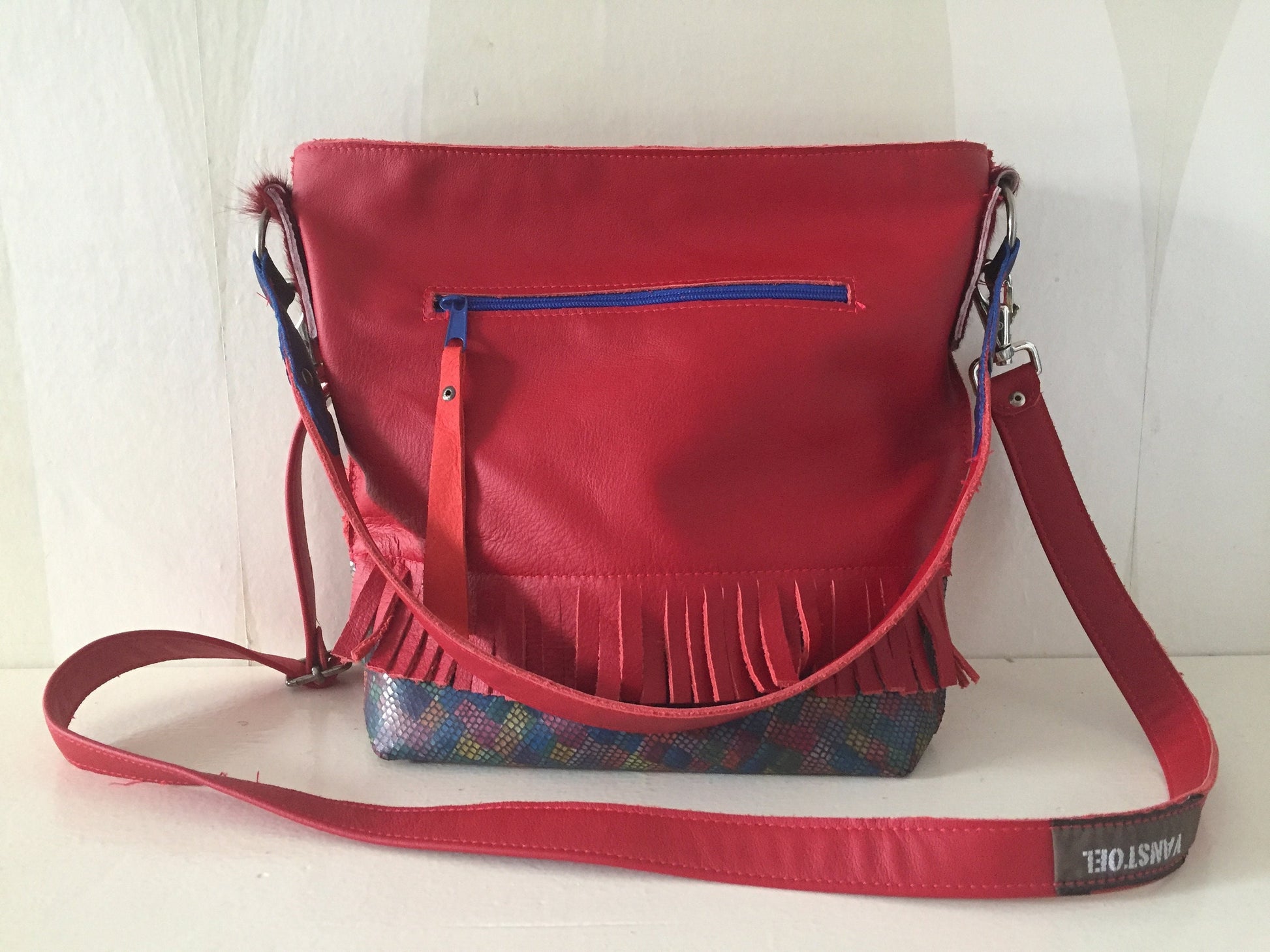 Schoudertas van rood soepel leer voorzien van een voorvak met blauwe rits. Leren franjes aan de voorkant. De tas is afsluitbaar met een groene rits en heeft een verstelbaar hengsel van 130 cm en een vast hengsel van 60 cm. De tas is kleurrijk gevoerd, voorzien van een binnenvak met rits en een vakje voor mobiel en portemonnee.