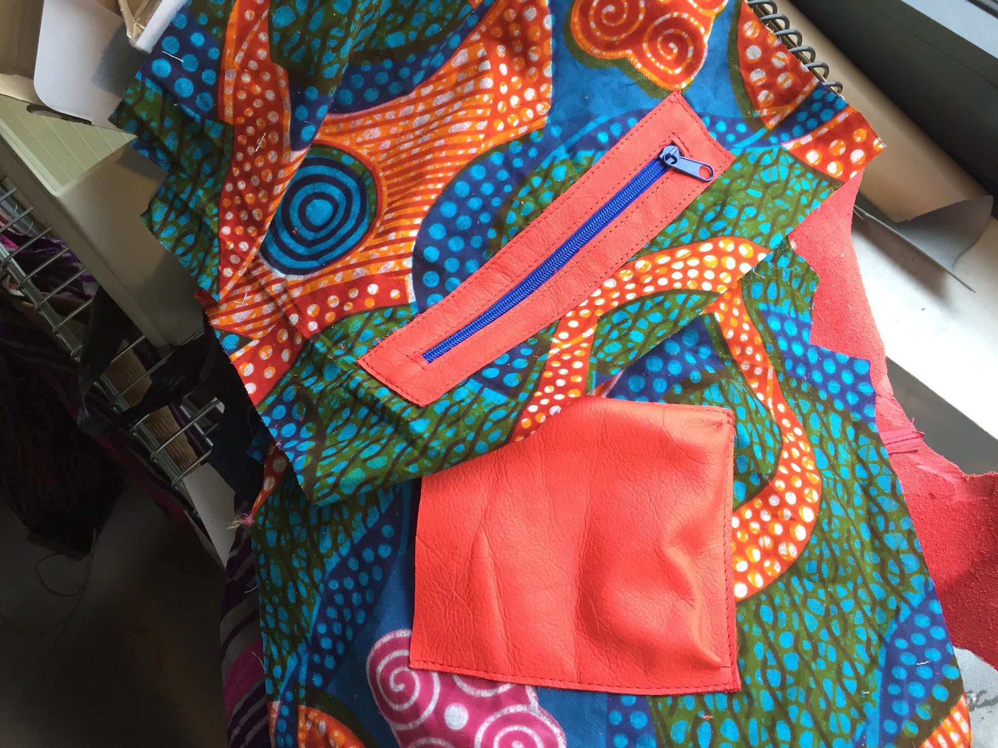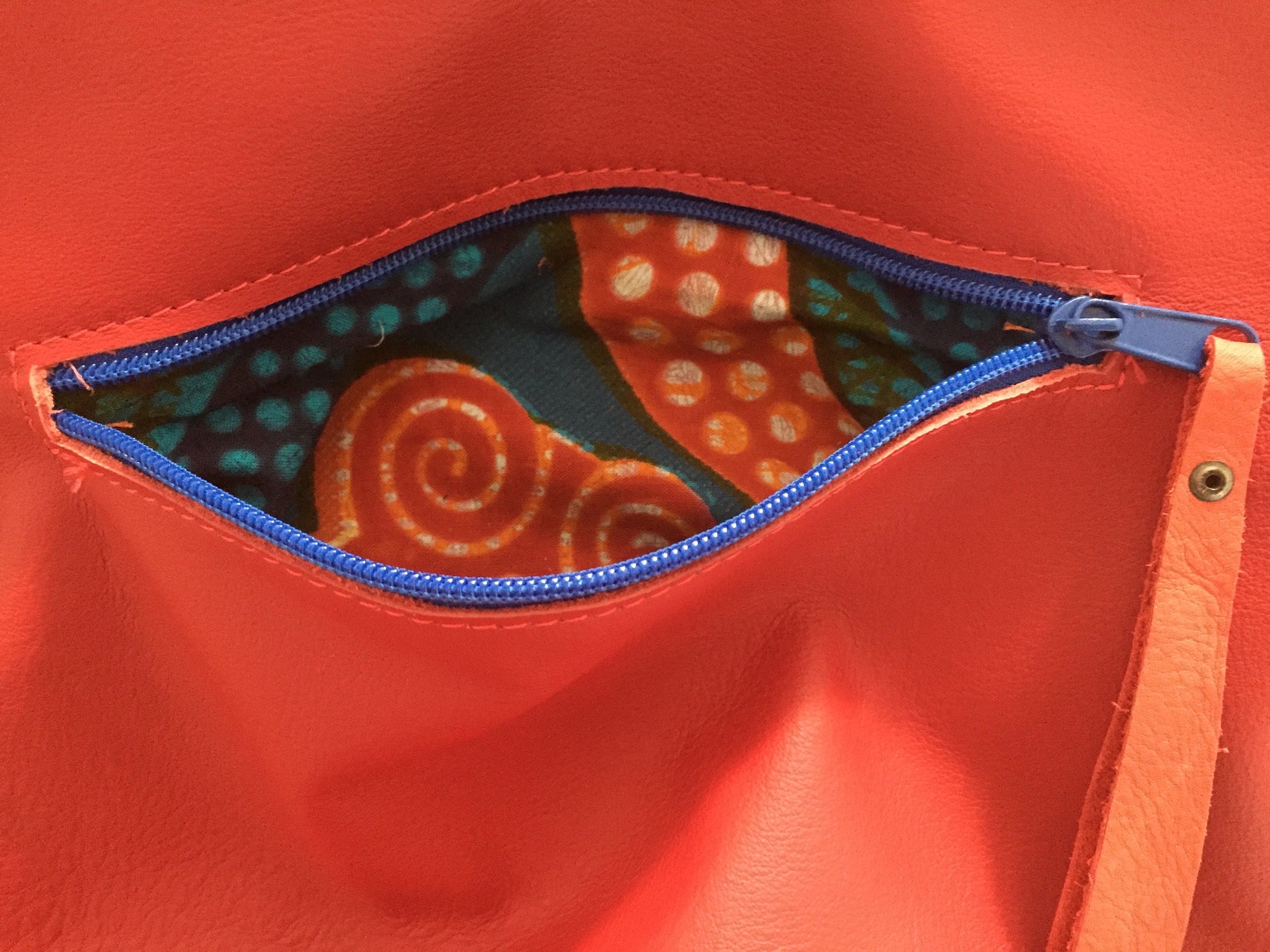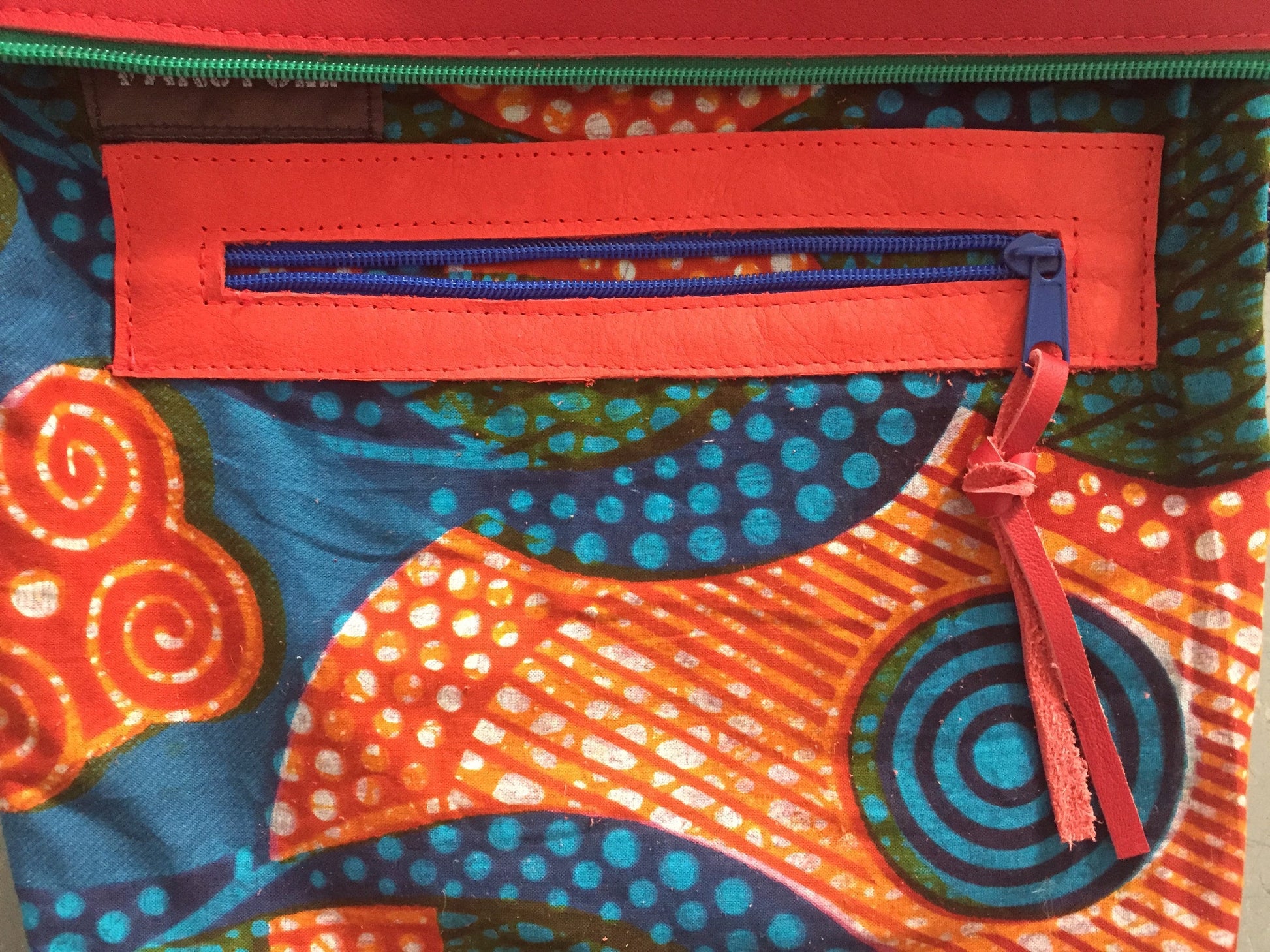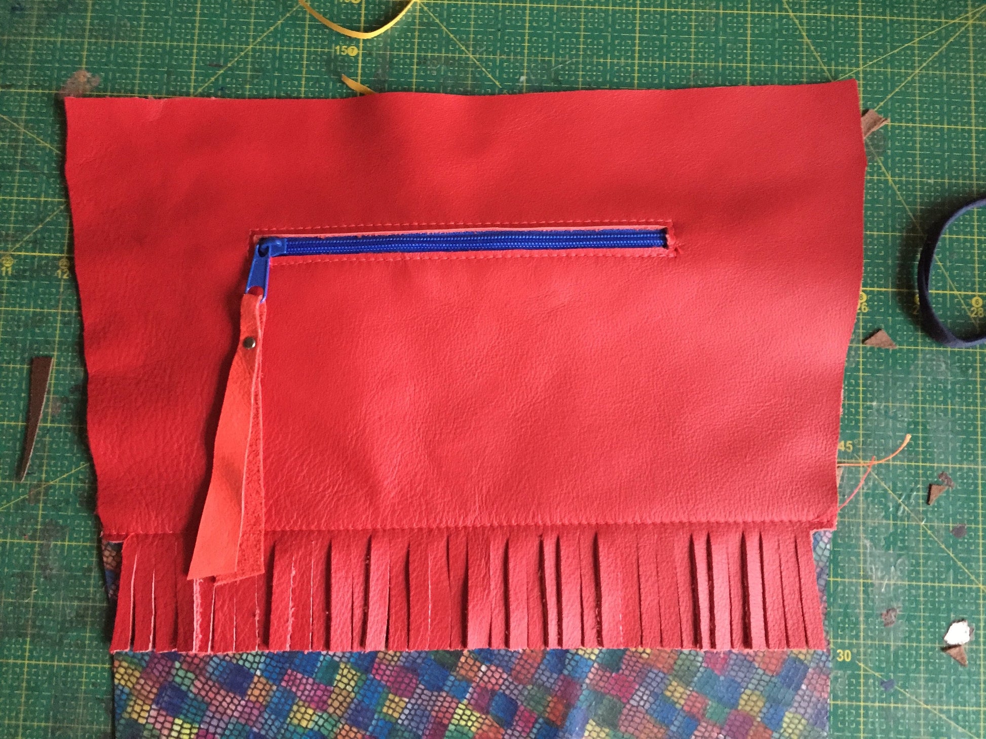 Schoudertas van rood soepel leer voorzien van een voorvak met blauwe rits. Leren franjes aan de voorkant. De tas is afsluitbaar met een groene rits en heeft een verstelbaar hengsel van 130 cm en een vast hengsel van 60 cm. De tas is kleurrijk gevoerd, voorzien van een binnenvak met rits en een vakje voor mobiel en portemonnee.