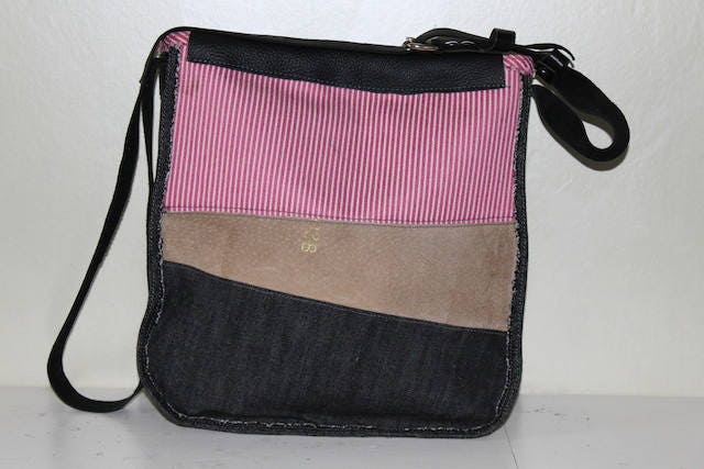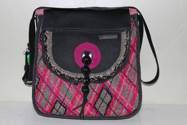 Tas gemaakt van meubelstof met opgestikt patroon van wol. De achterkant is van spijkerstof en leer. De tas is gevoerd met stof en voorzien van een binnenvak met rits. De klep is van leer met een sluiting van grote kralen. Het hengsel van leer is verstelbaar in lengte.