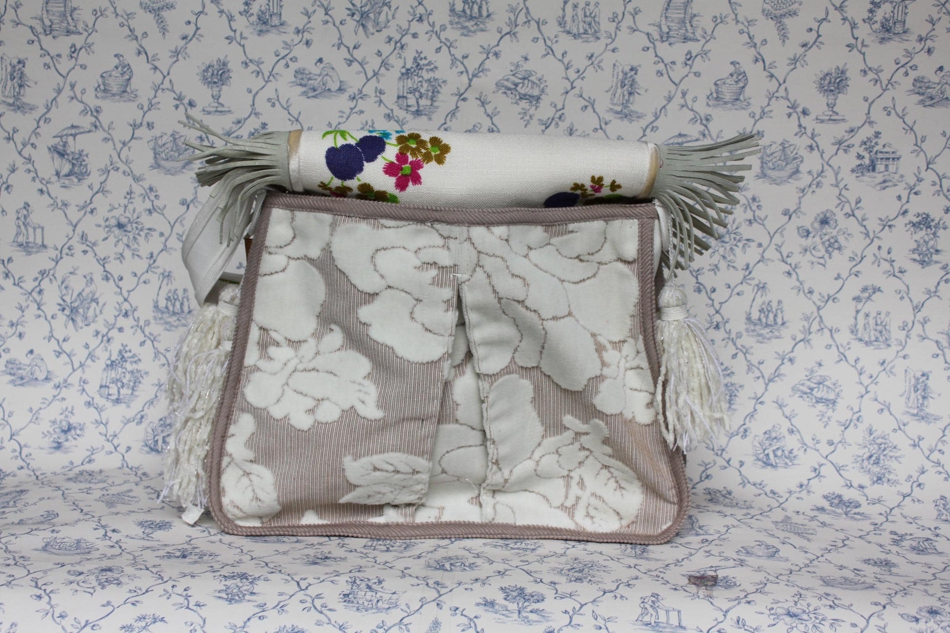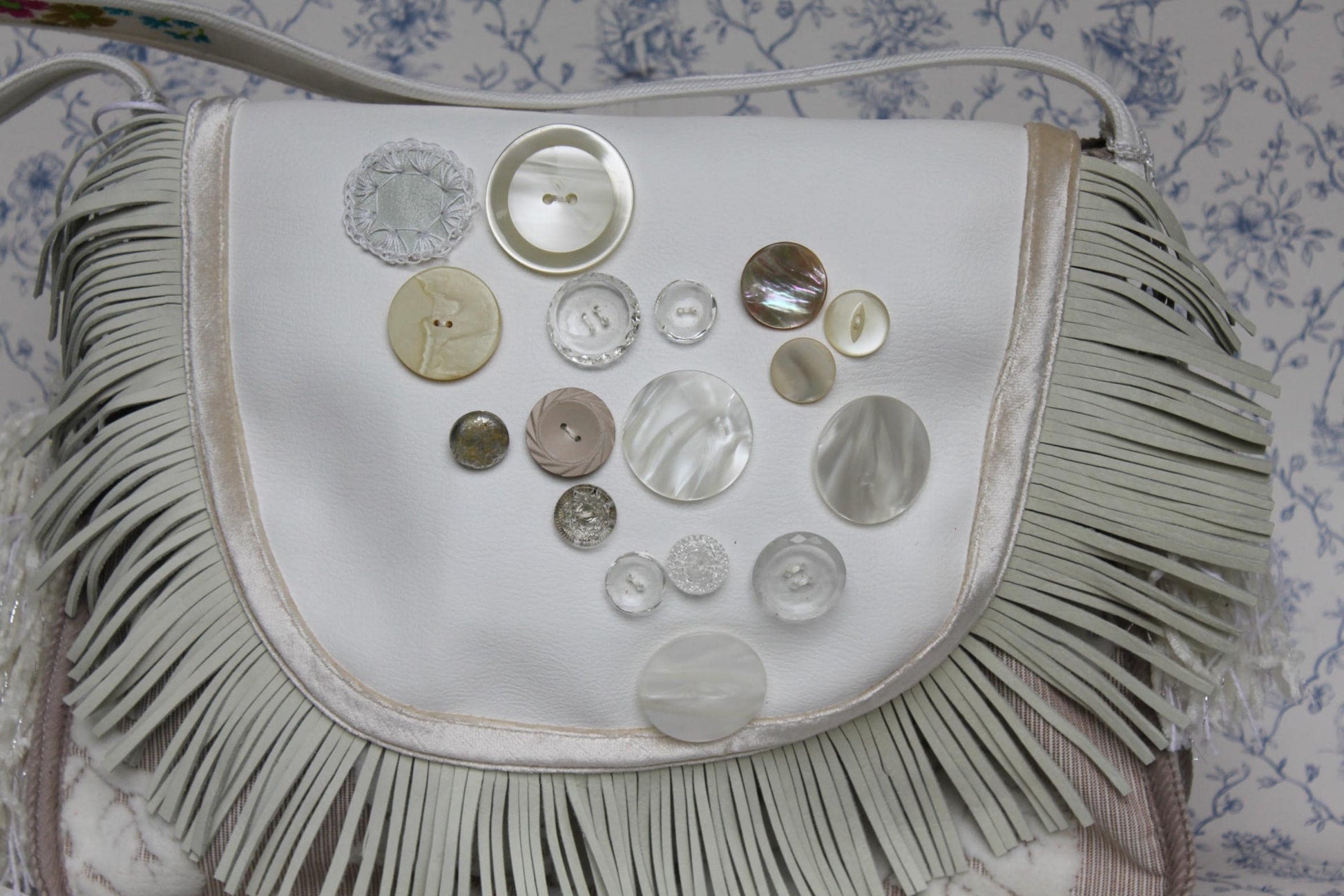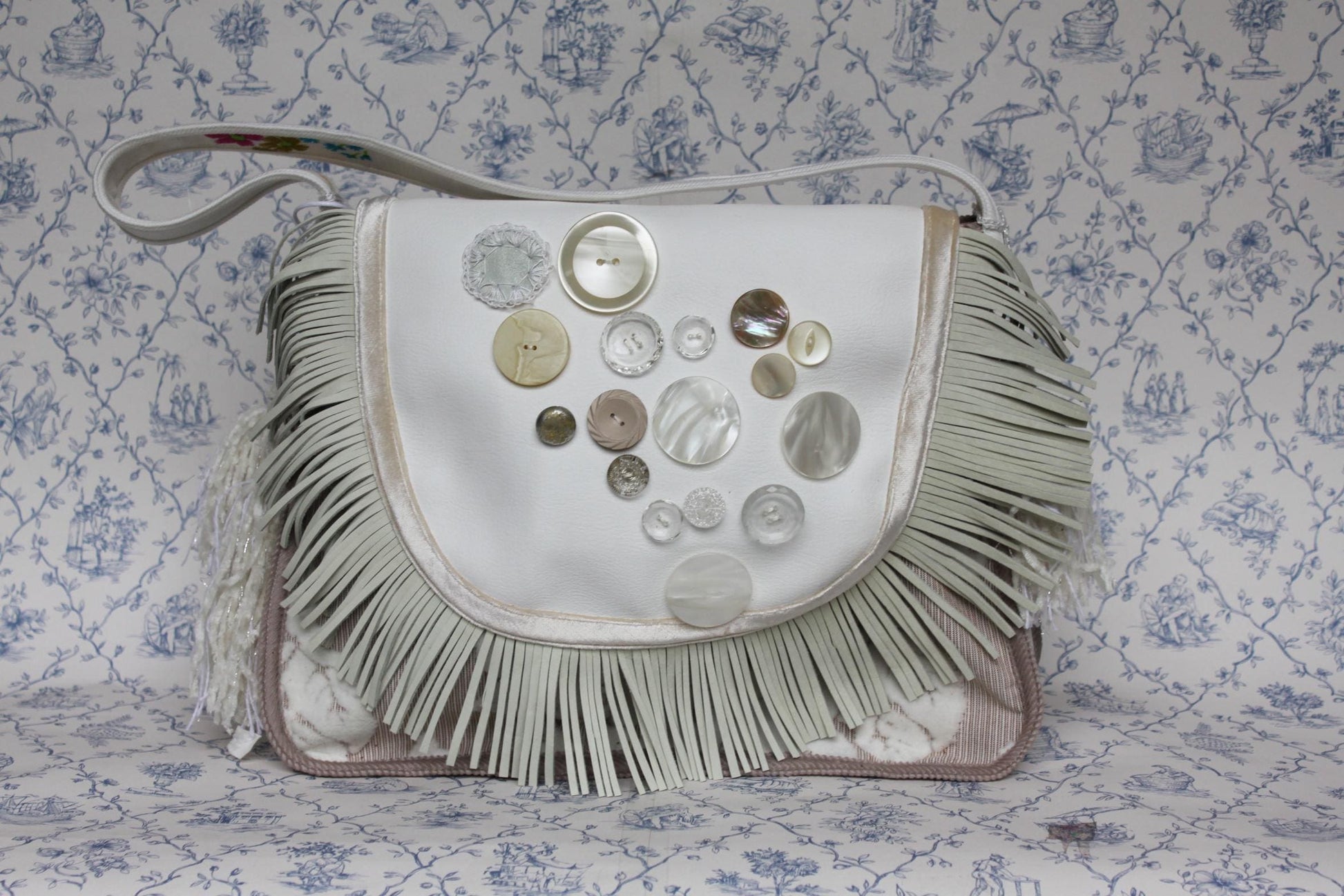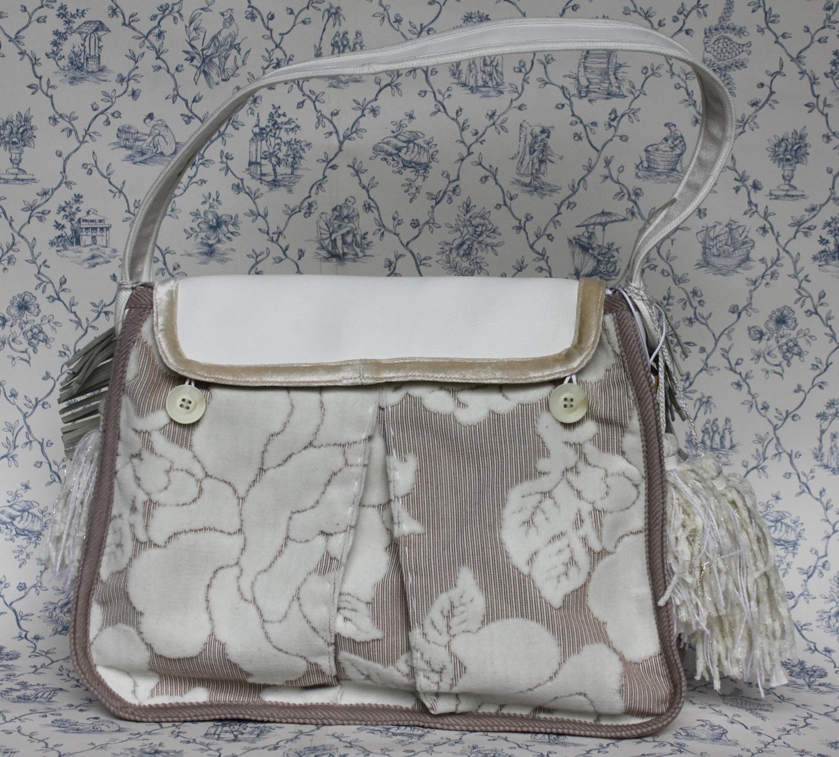 Witte meubelstof skai tas met klep met opgestikte knopen en leren franjes. Zijkanten zijn voorzien van kwastjes. De binnenkant heeft een extra vakje met rits en de tas is afsluitbaar met een magneetsluiting.